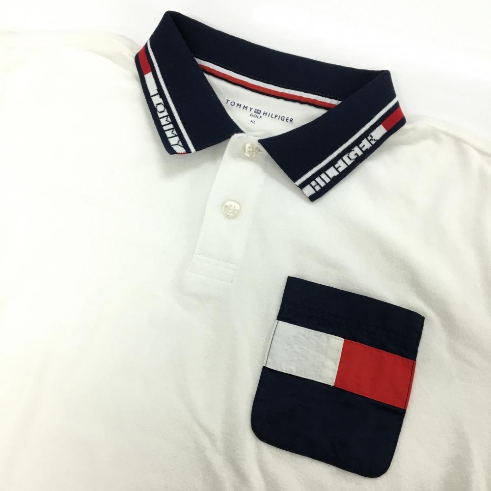 トミーヒルフィガー 半袖ポロシャツ 白×ネイビー パイル地 胸ポケット メンズ XL ゴルフウェア Tommy Hilfiger Golf
