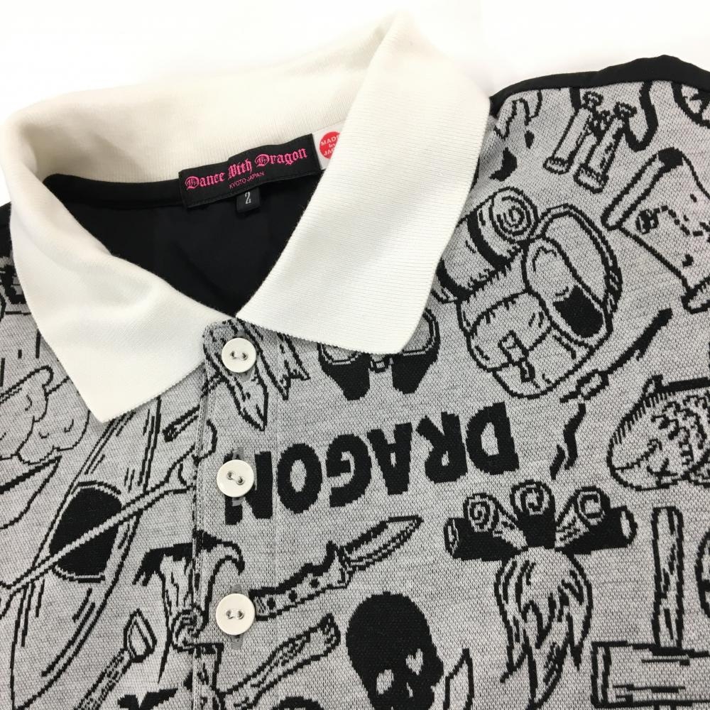 【美品】ダンスウィズドラゴン 半袖ポロワンピース 白×黒 前身ごろ・袖総柄 背面ロゴ レディース 2(M) ゴルフウェア Dance With Dragon