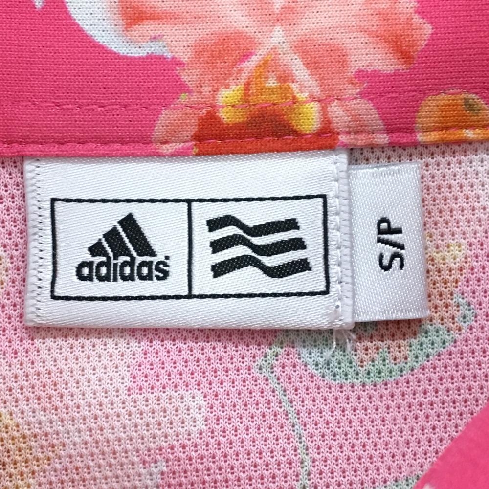 【超美品】アディダス 半袖ポロシャツ ピンク×マルチカラー 花柄 果実 ロゴ刺しゅう レディース S/P ゴルフウェア adidas