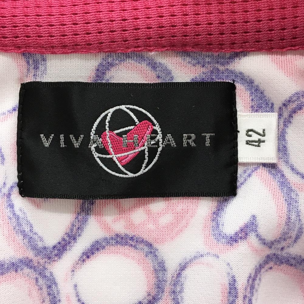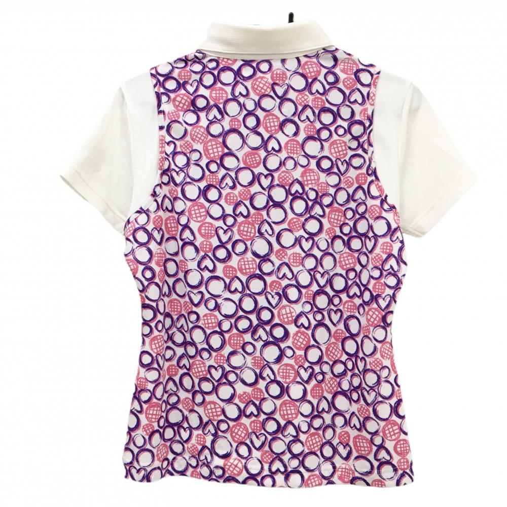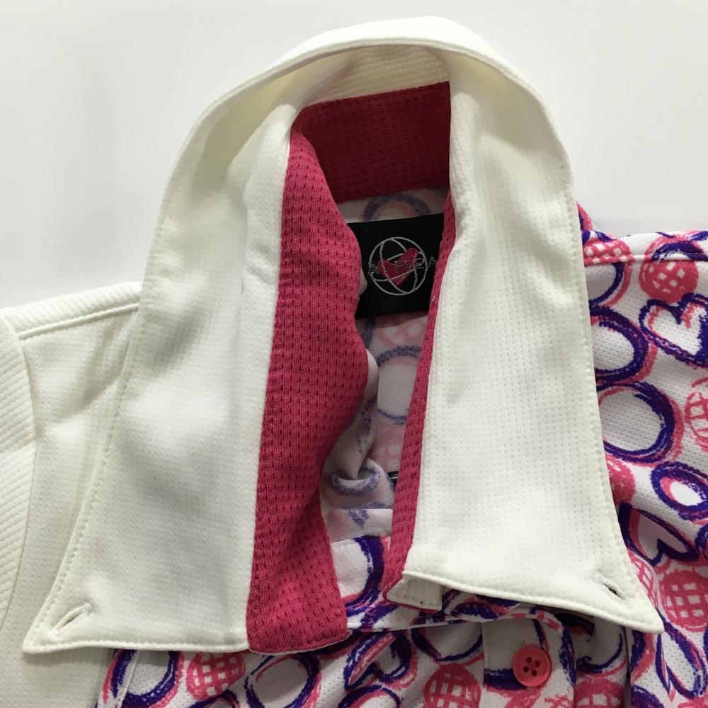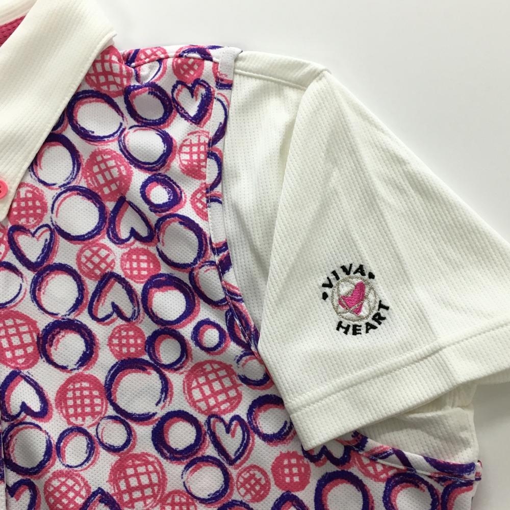 ビバハート 半袖ポロシャツ 白×ピンク レイヤード風 手書き風総柄 ハート レディース 42(L) ゴルフウェア VIVA HEART