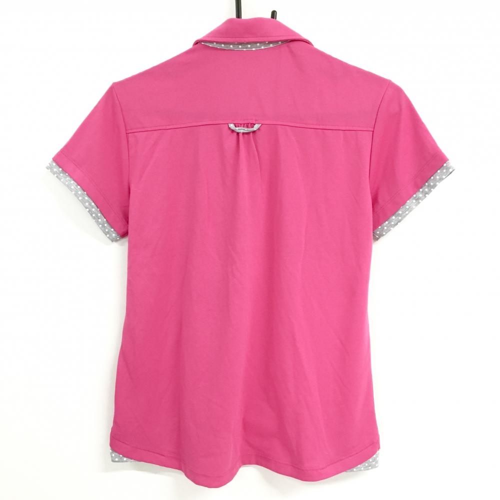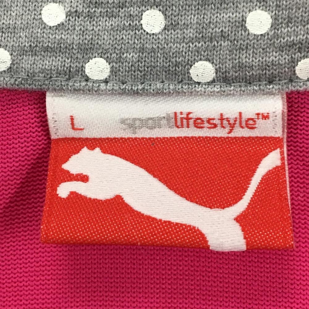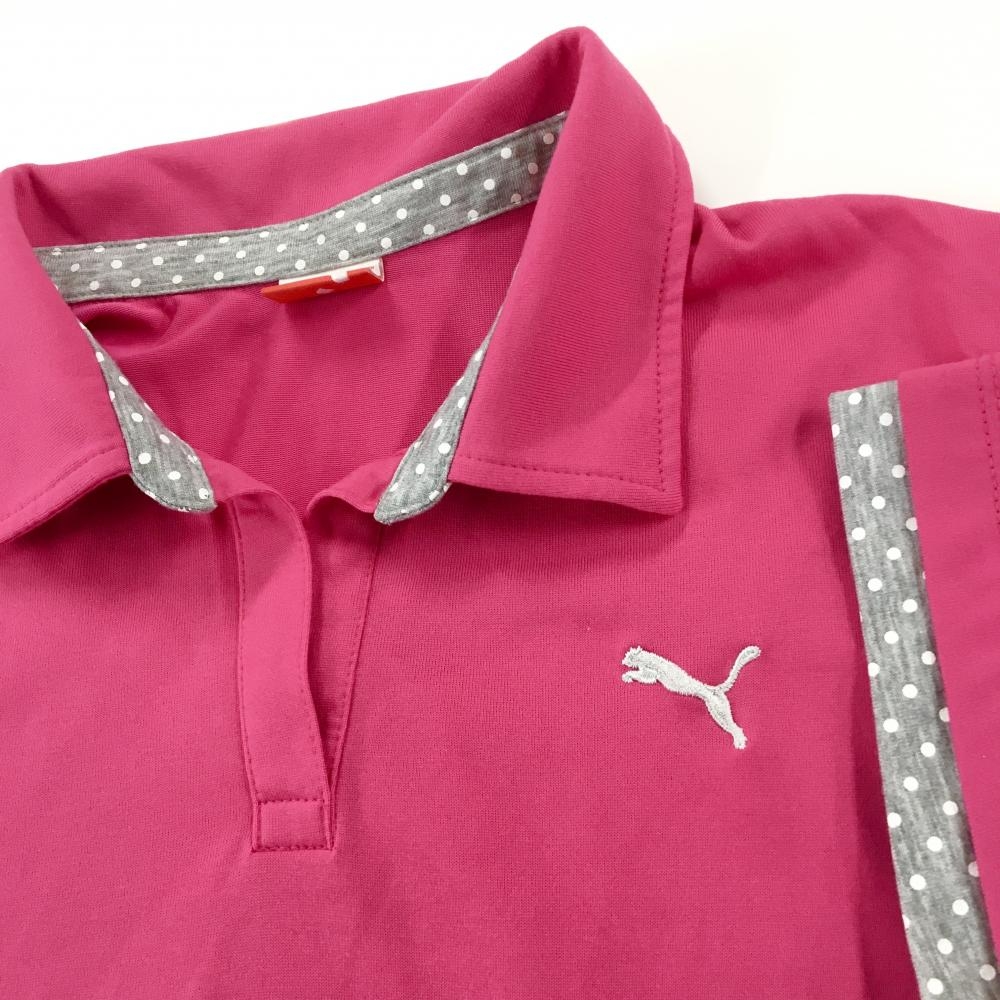 【超美品】プーマ 半袖スキッパーシャツ ピンク×グレー 一部ドット ロゴ刺しゅう レディース L ゴルフウェア PUMA