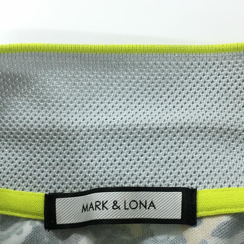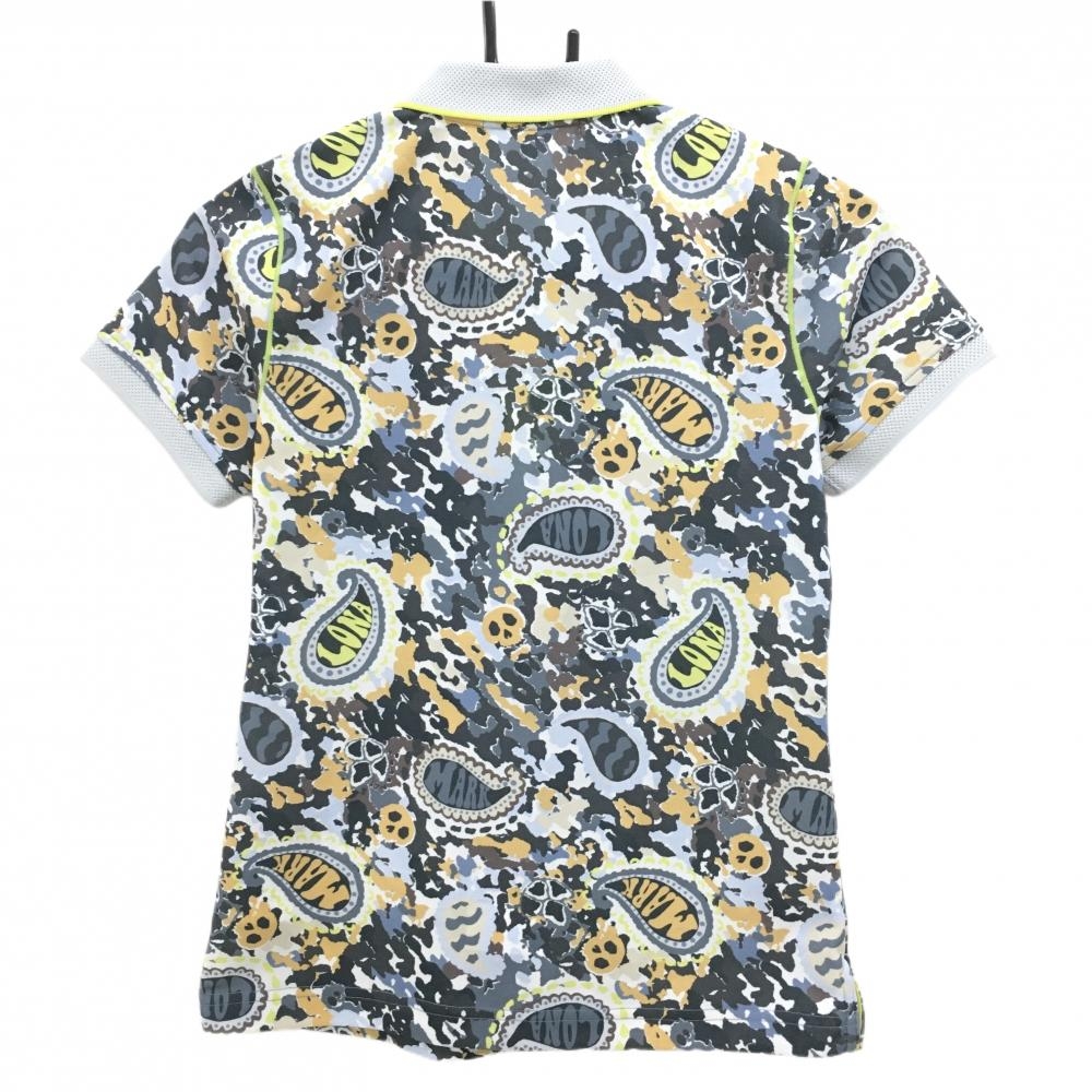 【美品】マークアンドロナ 半袖ポロシャツ グレー×イエロー 総柄 スカル ラインストーン レディース 36(S) ゴルフウェア MARK&LONA