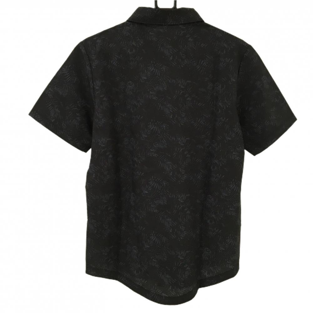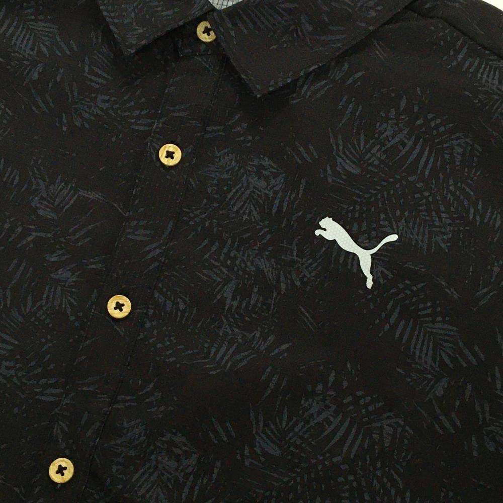 【超美品】プーマ 半袖シャツ 黒系×ブルーグレー系 総柄 リーフ 胸ロゴプリント メンズ L ゴルフウェア PUMA