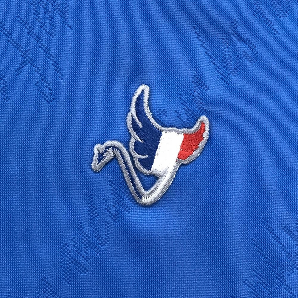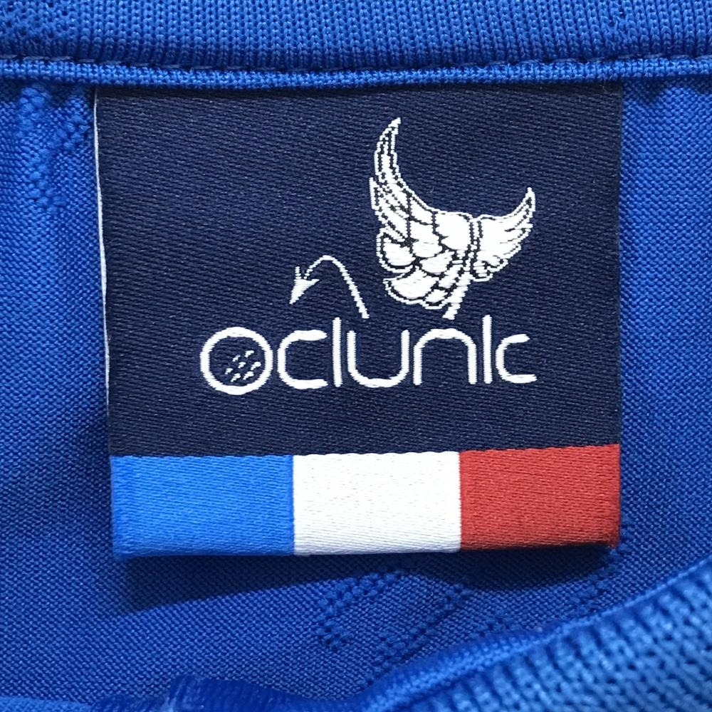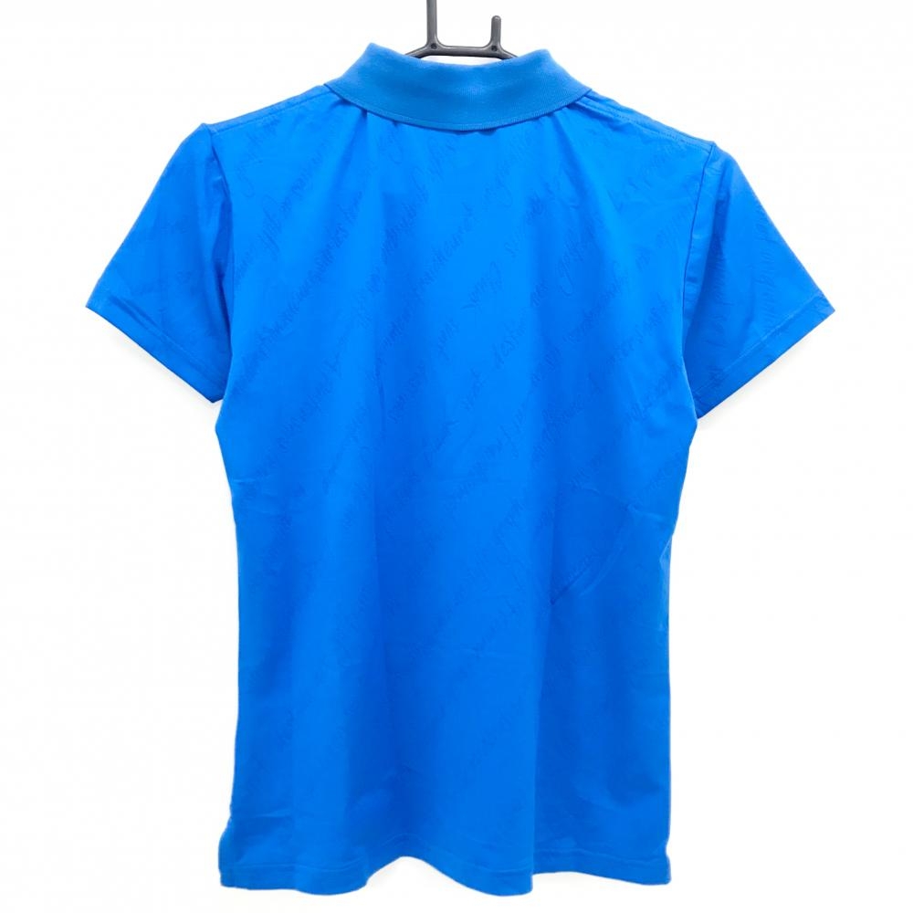 【超美品】クランク 半袖ポロシャツ ブルー 英字総柄 ロゴワッペン レディース M ゴルフウェア CLUNK