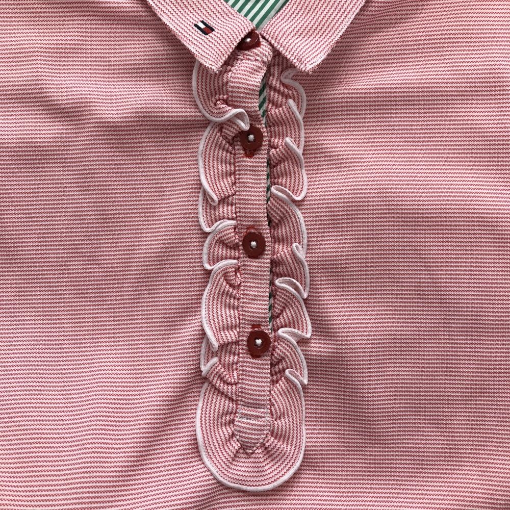 【美品】トミーヒルフィガーゴルフ 長袖ポロシャツ ピンク系×白 前立てフリル 襟ロゴ レディース S ゴルフウェア Tommy Hilfiger Golf