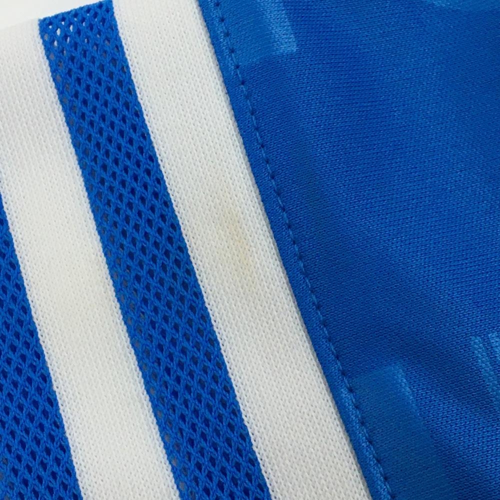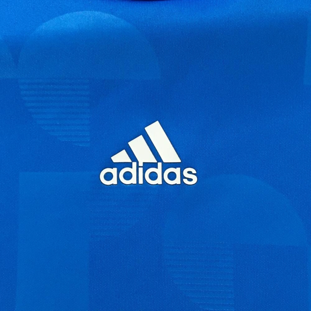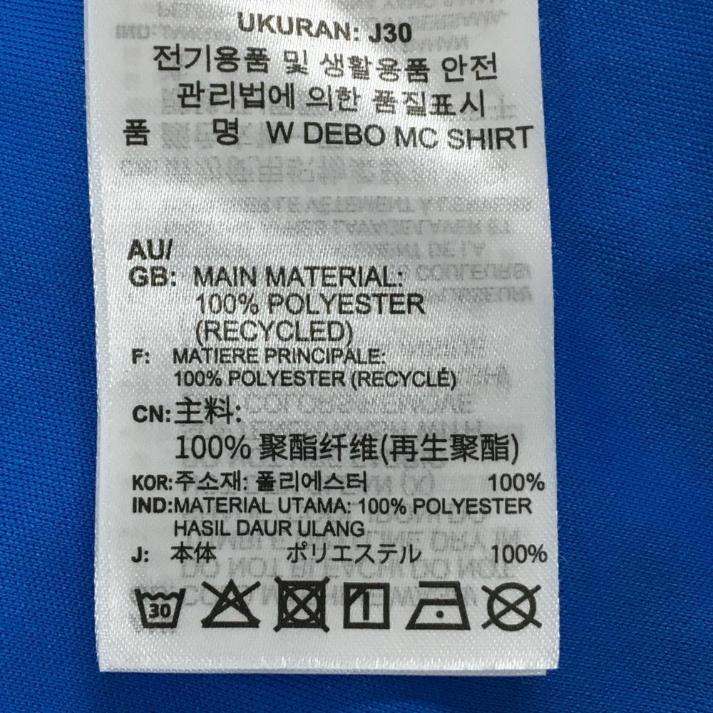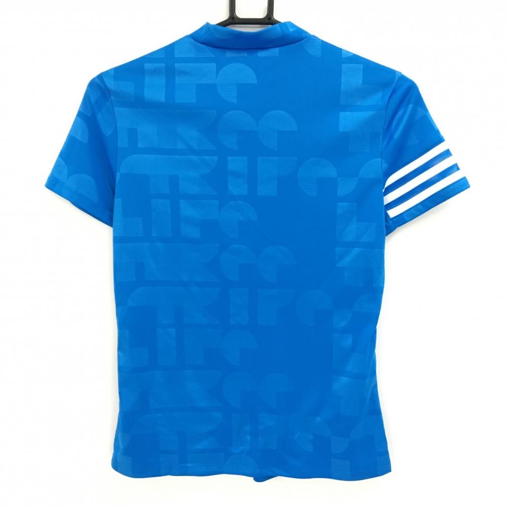 【美品】アディダス 半袖ハイネックシャツ ブルー 地模様 袖3ライン レディース S ゴルフウェア adidas
