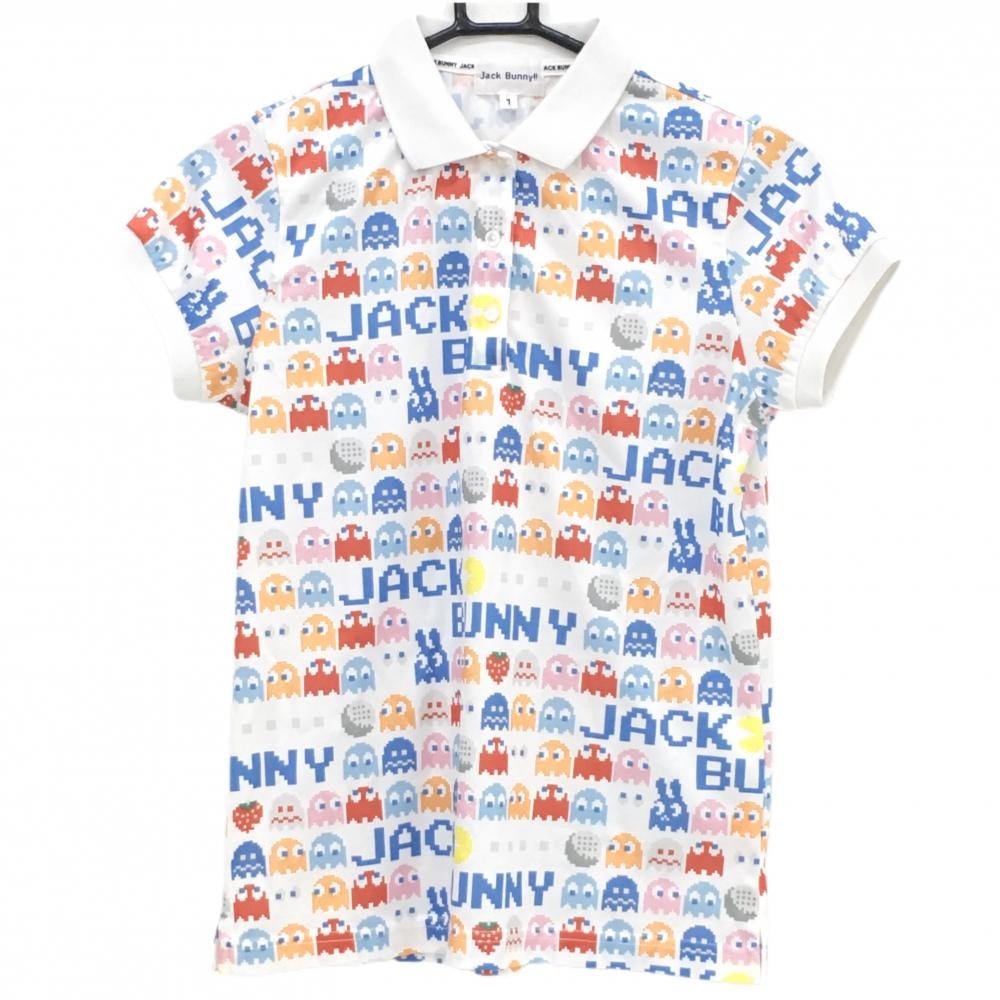 【美品】ジャックバニー×パックマン 半袖ポロシャツ 白×マルチカラー パックマン総柄 レディース 1(M) ゴルフウェア Jack Bunny