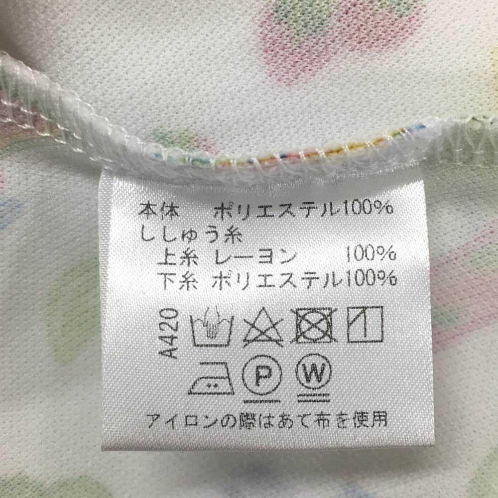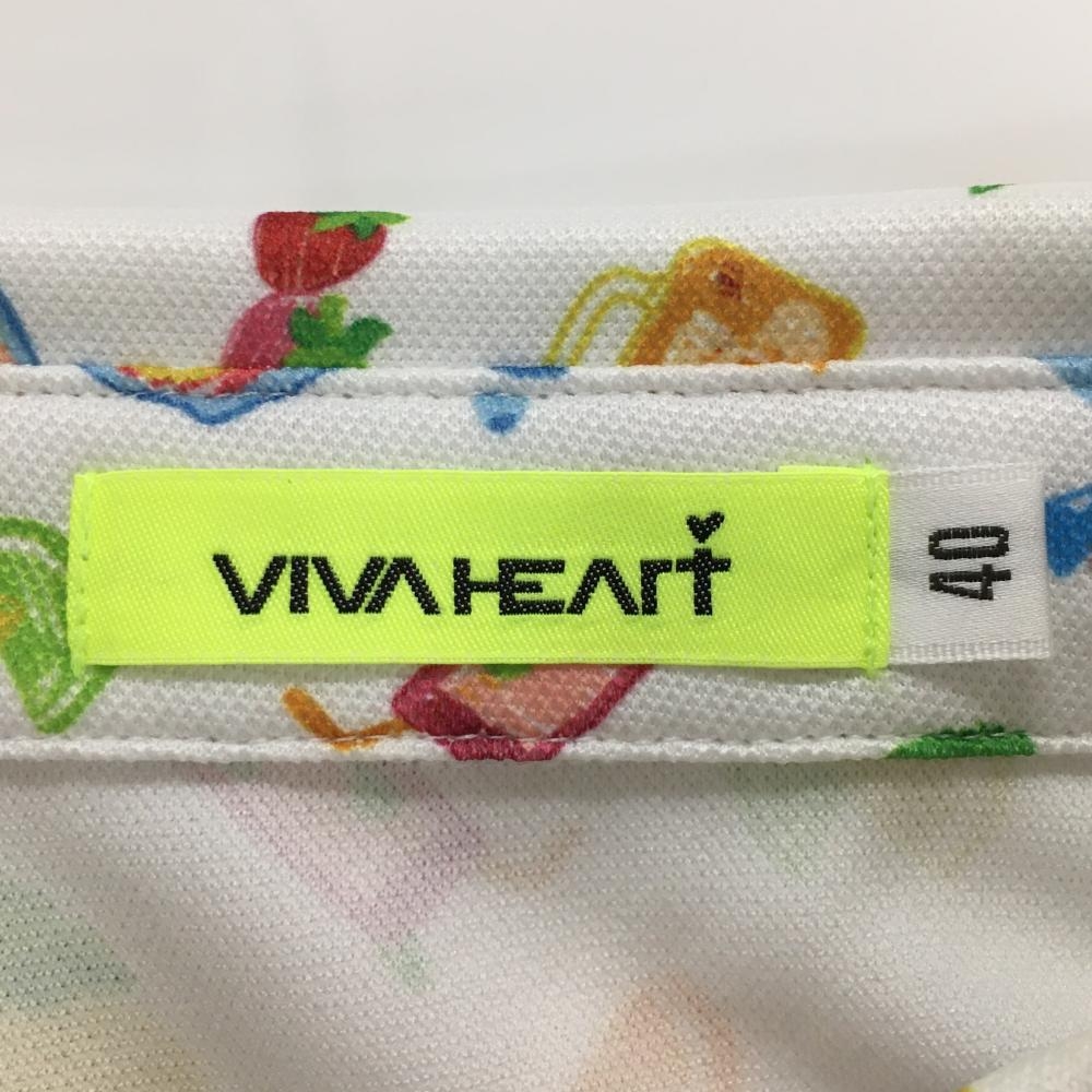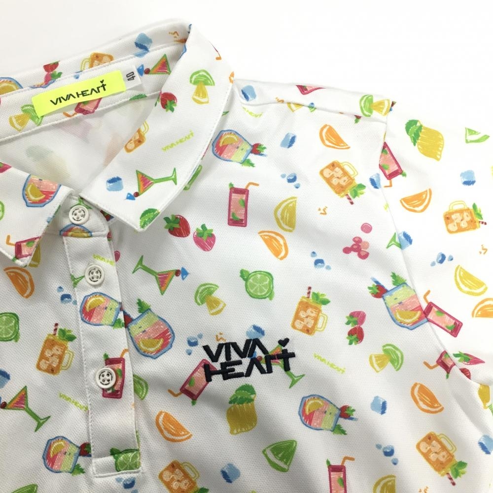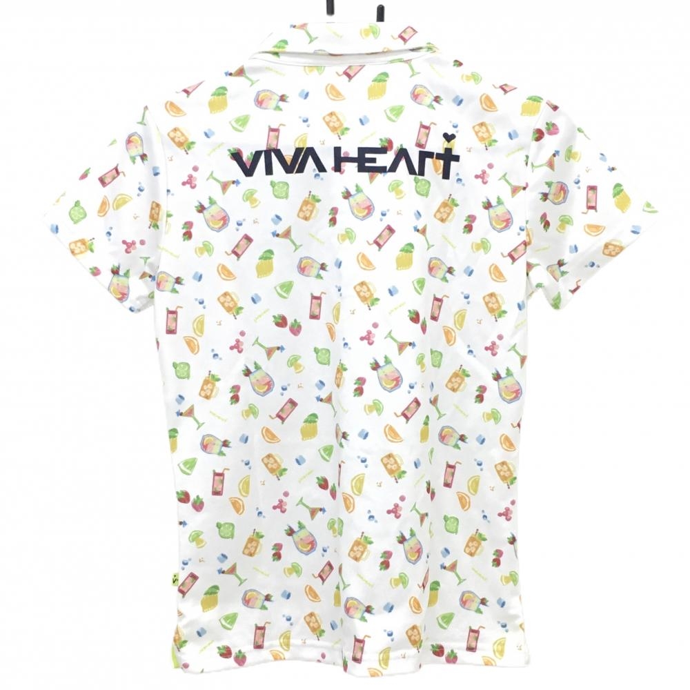 【超美品】ビバハート 半袖ポロシャツ 白×マルチカラー フルーツ・カクテルグラス総柄 ロゴ レディース 40(M) ゴルフウェア VIVA HEART