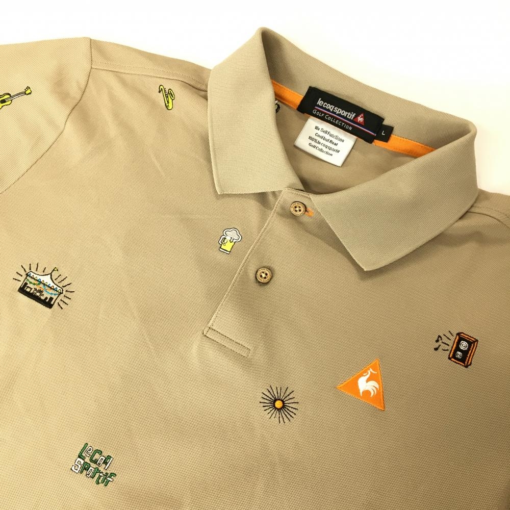 【超美品】ルコックゴルフ 半袖ポロシャツ ベージュ 刺しゅう総柄 ギター メンズ L ゴルフウェア le coq sportif