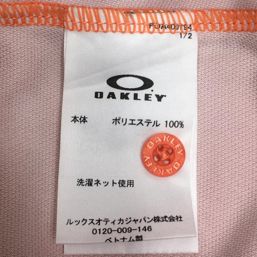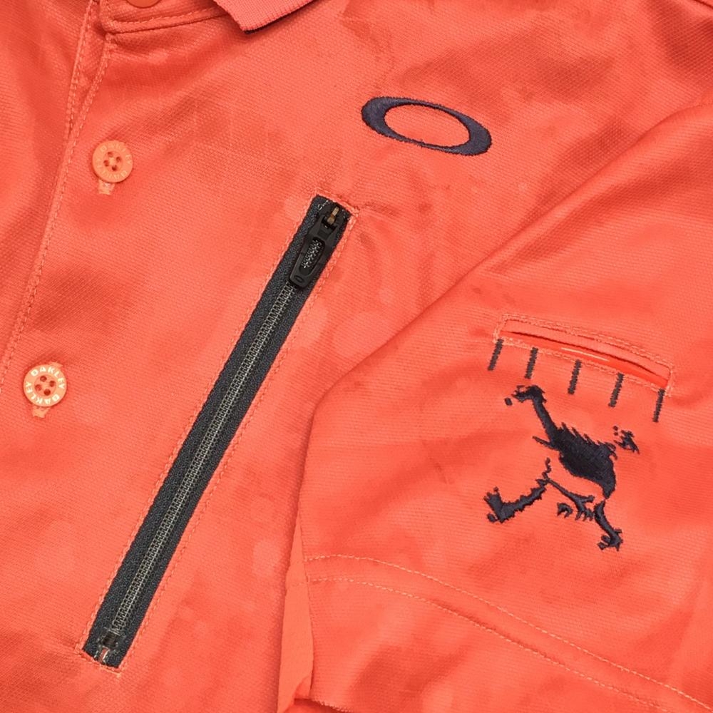 【超美品】オークリー 半袖ポロシャツ オレンジ 総柄地模様 ロゴグレー ティー装着可 メンズ M ゴルフウェア Oakley
