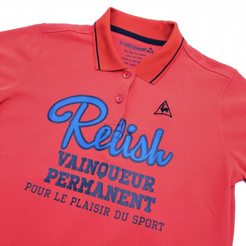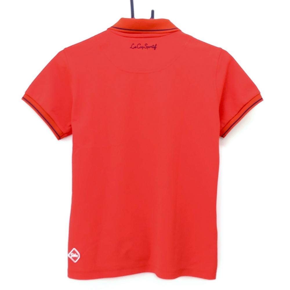 【美品】ルコックゴルフ 半袖ポロシャツ レッド×ネイビー フロント英字 ロゴ刺しゅう レディース L ゴルフウェア le coq sportif
