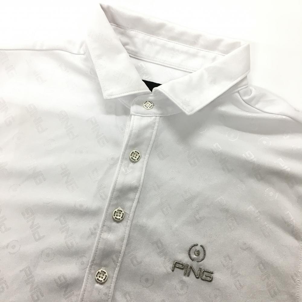【美品】ピン 半袖ポロシャツ 白 ロゴ総柄 胸元刺しゅう メンズ L ゴルフウェア PING