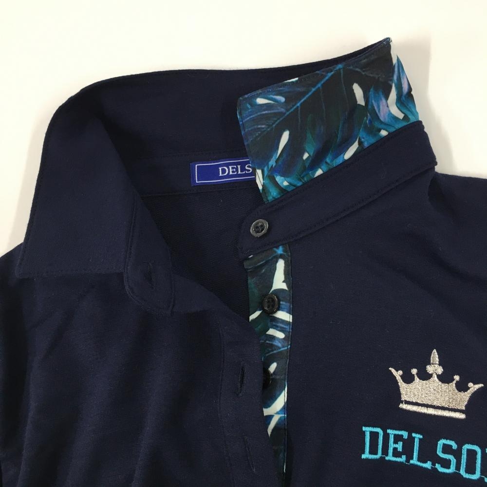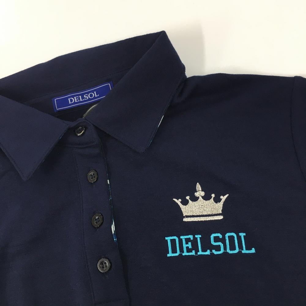 【超美品】デルソル 半袖ポロシャツ ネイビー バックロゴ 襟裏・前立て裏総柄 ロゴ刺しゅう レディース LL ゴルフウェア DELSOL