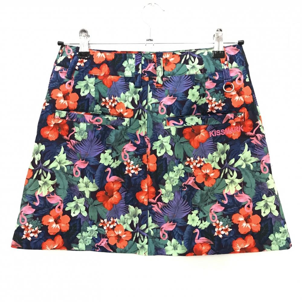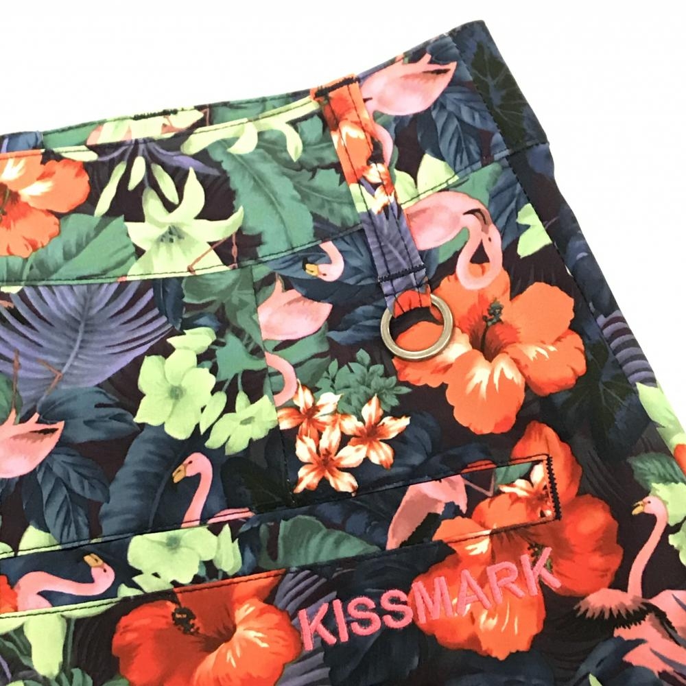 【超美品】キスマーク スカート レッド×ライトグリーン ハイビスカス・リーフ柄 ストレッチ レディース 7 ゴルフウェア KISS MARK