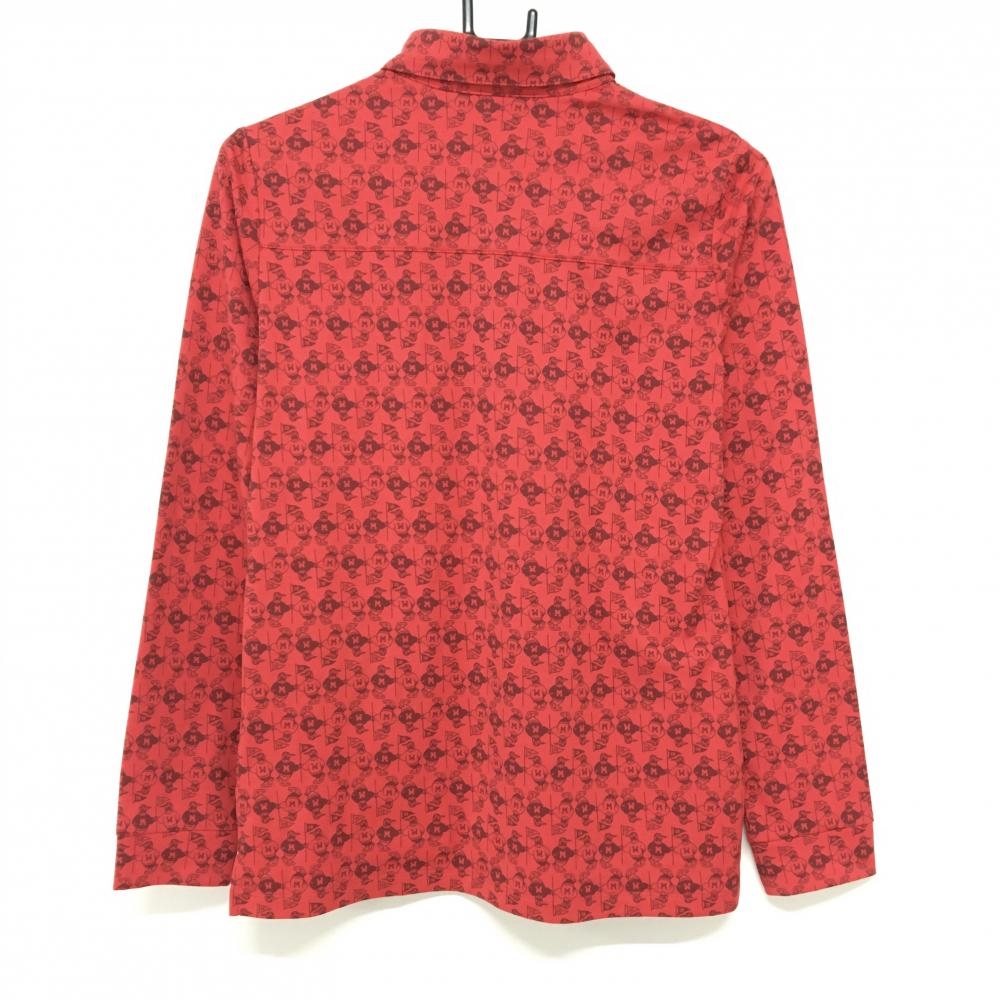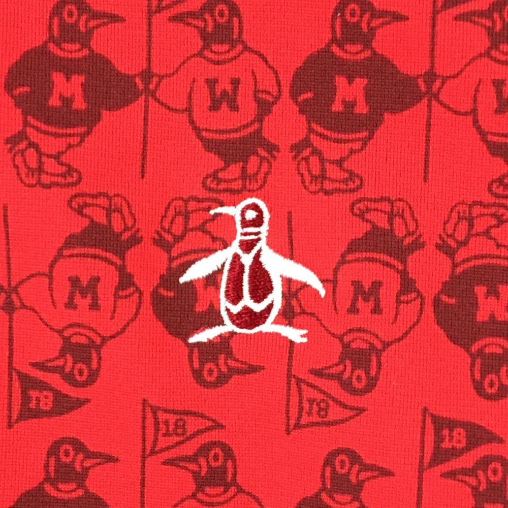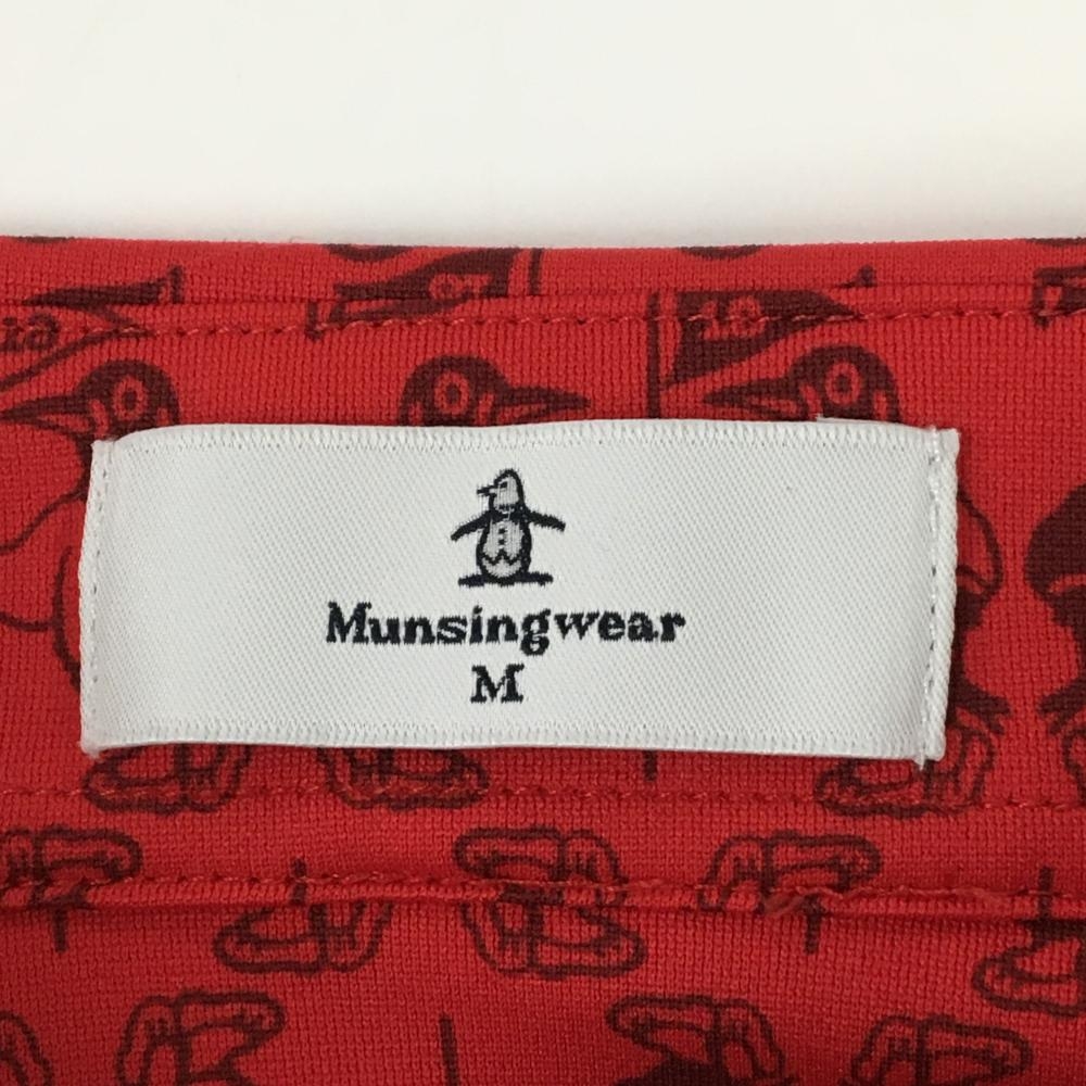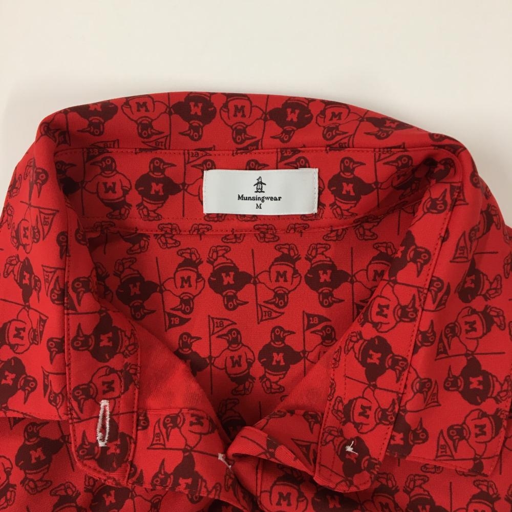 【美品】マンシングウェア 長袖ポロシャツ レッド ペンギン総柄 ロゴ刺しゅう白 レディース M ゴルフウェア Munsingwear
