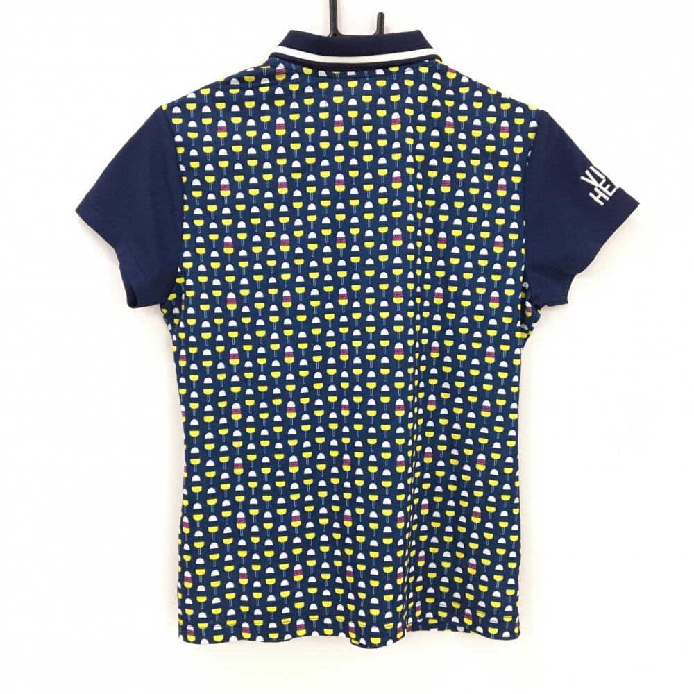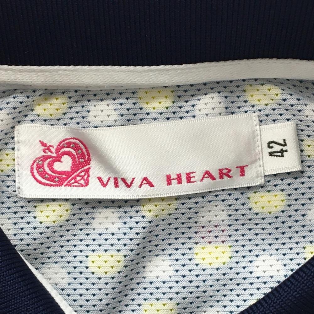 【超美品】ビバハート 半袖ポロシャツ ネイビー×白 身頃総柄 袖ロゴ刺しゅう レディース 42(L) ゴルフウェア VIVA HEART