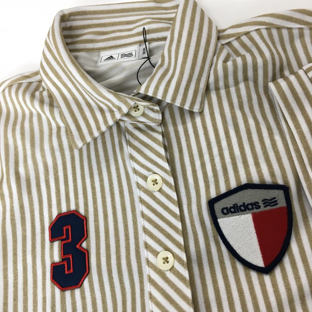 【新品】アディダス 半袖ポロワンピース 白×ベージュ ストライプ インナーパンツ付 レディース M/M ゴルフウェア adidas