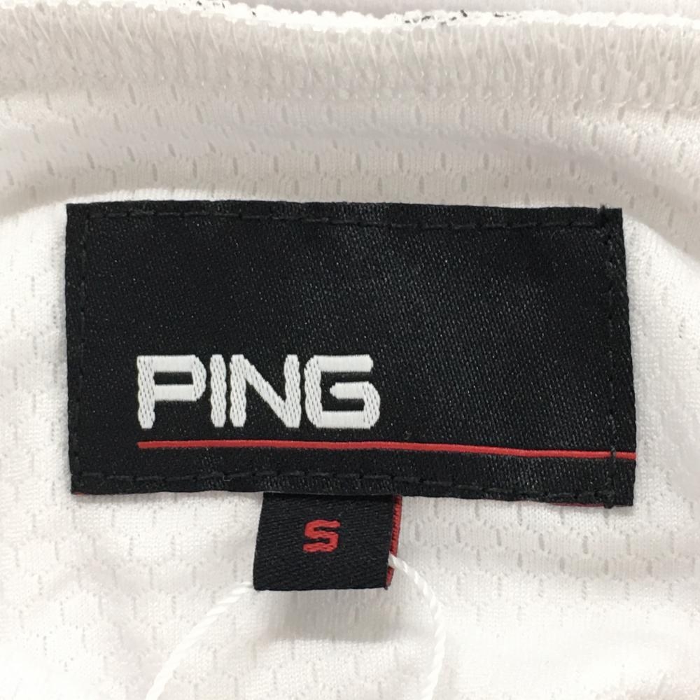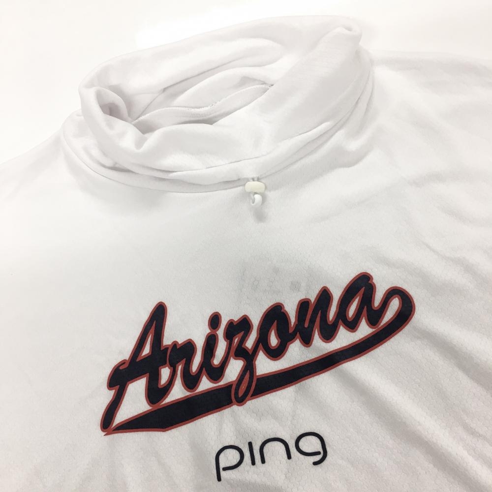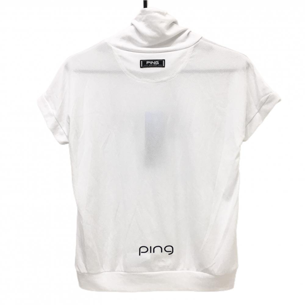【新品】ピン 半袖ハイネックシャツ 白×ネイビー フロントロゴプリント ネックドローコード レディース S ゴルフウェア 2023年モデル PING
