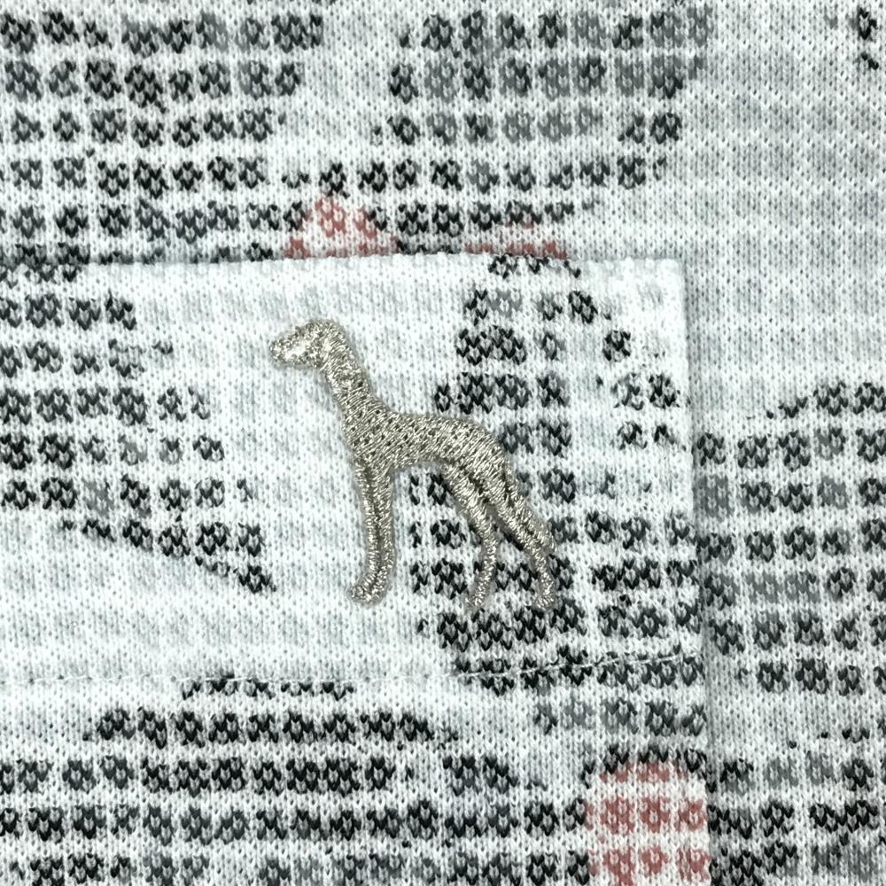 【超美品】アダバット 半袖ポロシャツ ライトグレー系×黒×レッド 総柄 リーフ ボタンダウン メンズ 48(L) ゴルフウェア adabat