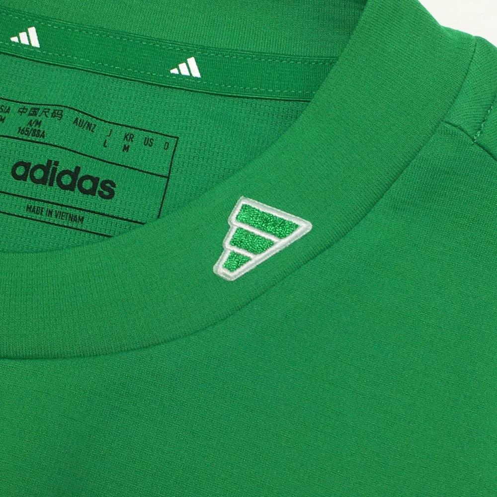 【超美品】アディダス Tシャツ グリーン×白 胸プリント ネックロゴ刺しゅう レディース L ゴルフウェア adidas
