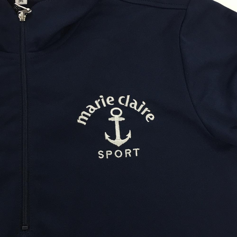 【超美品】マリクレールスポール 半袖ハイネックシャツ ネイビー×白 ロゴ刺しゅう ハーフジップ レディース M ゴルフウェア marie claire
