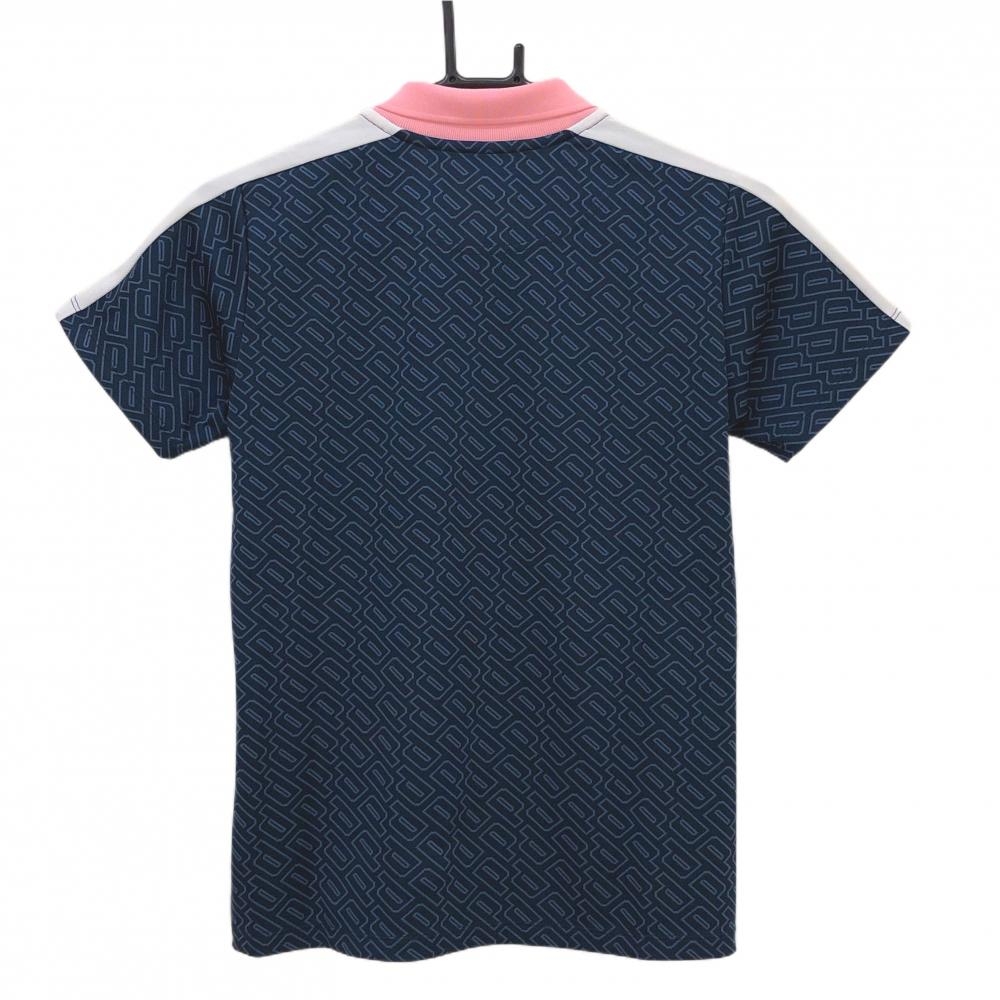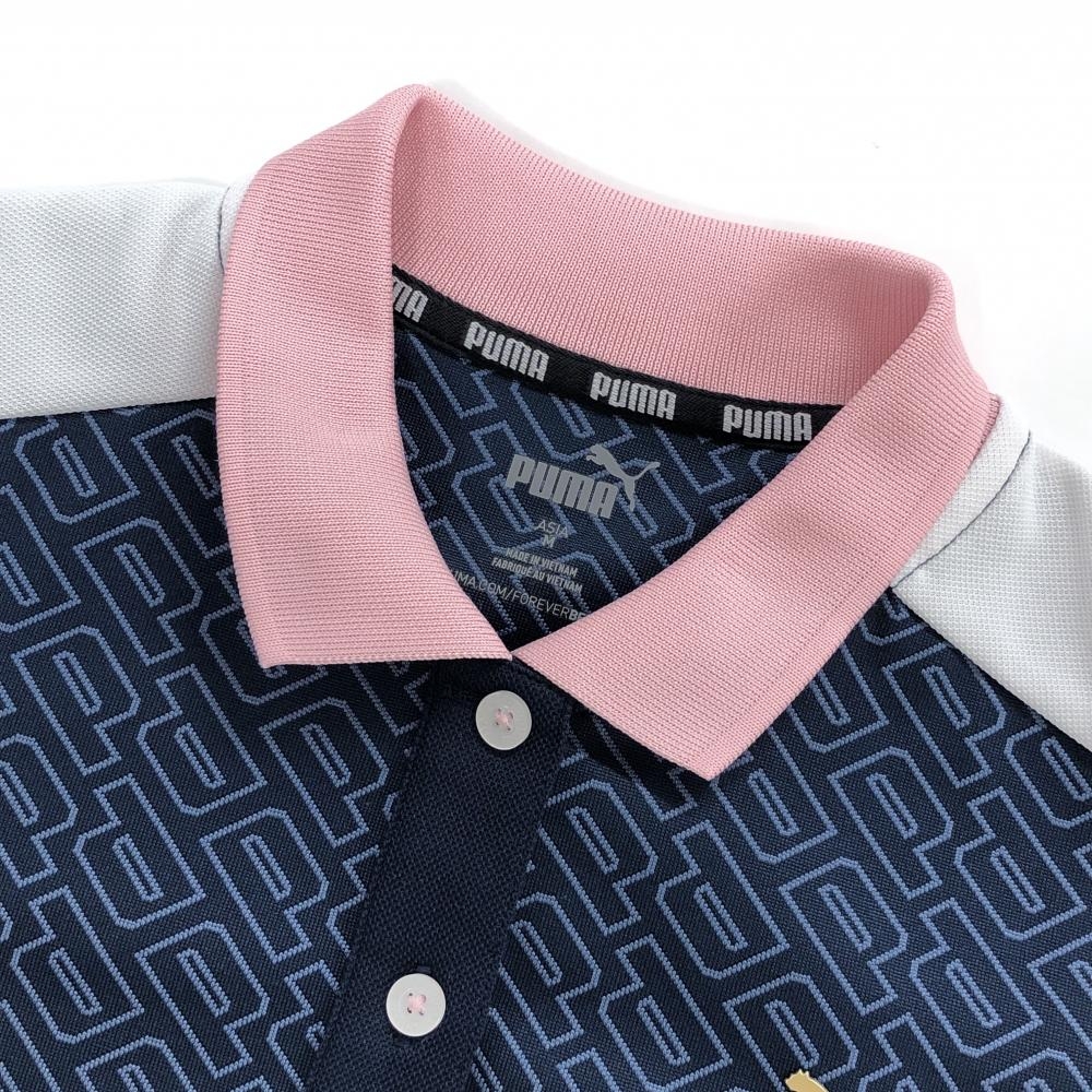 【超美品】プーマ 半袖ポロシャツ ネイビー ロゴ総柄 襟ピンク レディース M ゴルフウェア PUMA