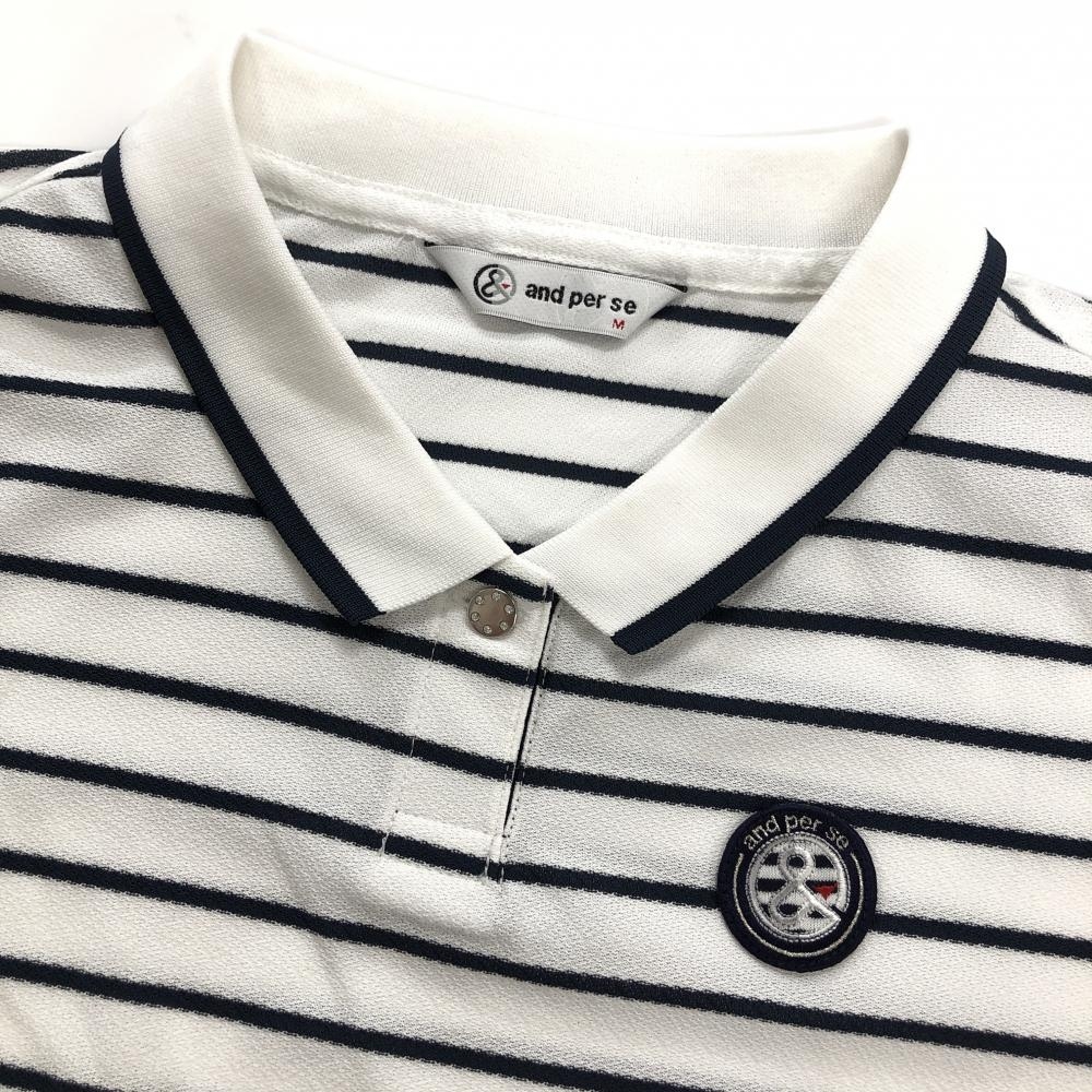 【超美品】アンパスィ 半袖ポロシャツ 白×ネイビー ボーダー ワッペン レディース M ゴルフウェア and per se