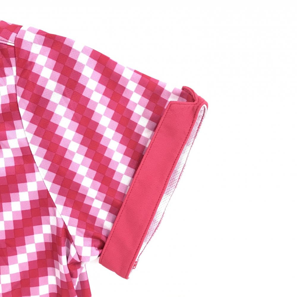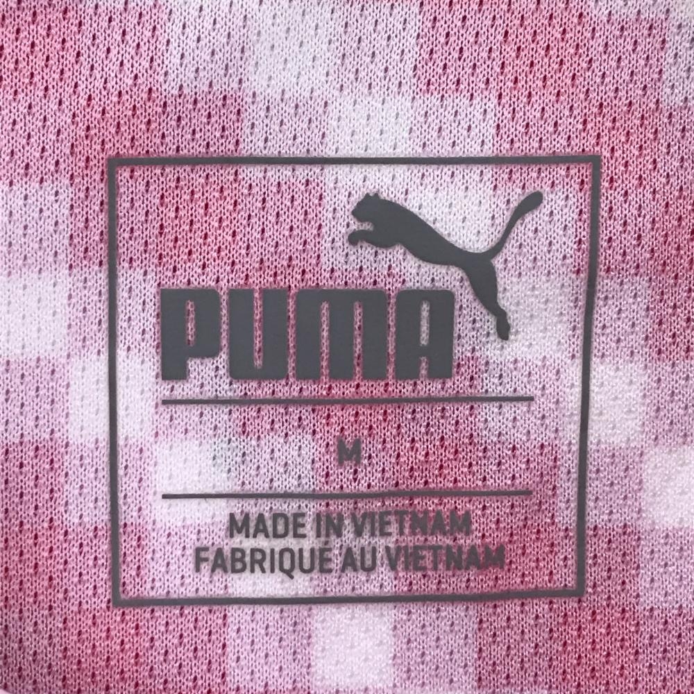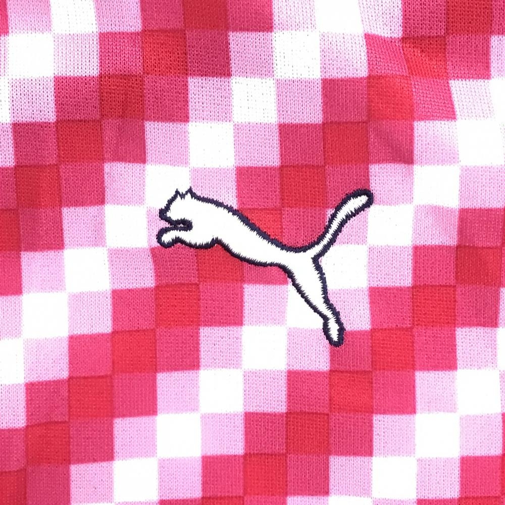 【超美品】プーマ 半袖ポロシャツ レッドピンク×白 モザイク調総柄 ロゴ レディース M ゴルフウェア PUMA