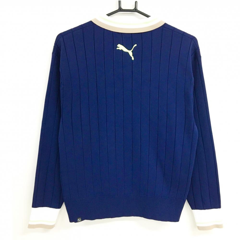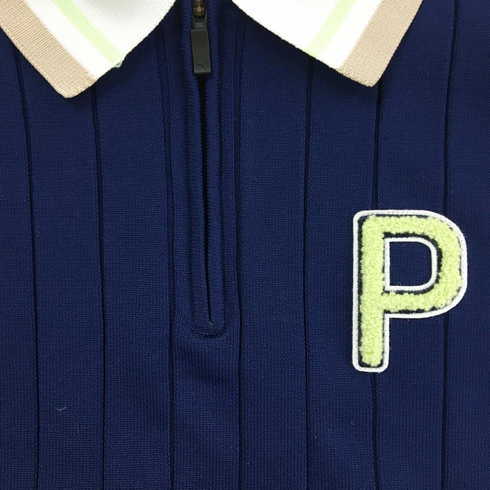 【超美品】プーマ 襟付きセーター ネイビー ストライプ調 凹凸生地 ハーフジップ ニット レディース M ゴルフウェア 2024年モデル PUMA