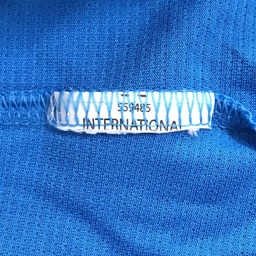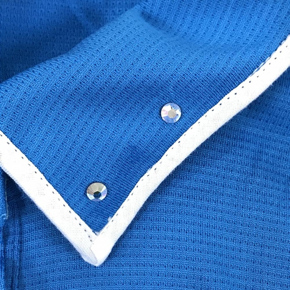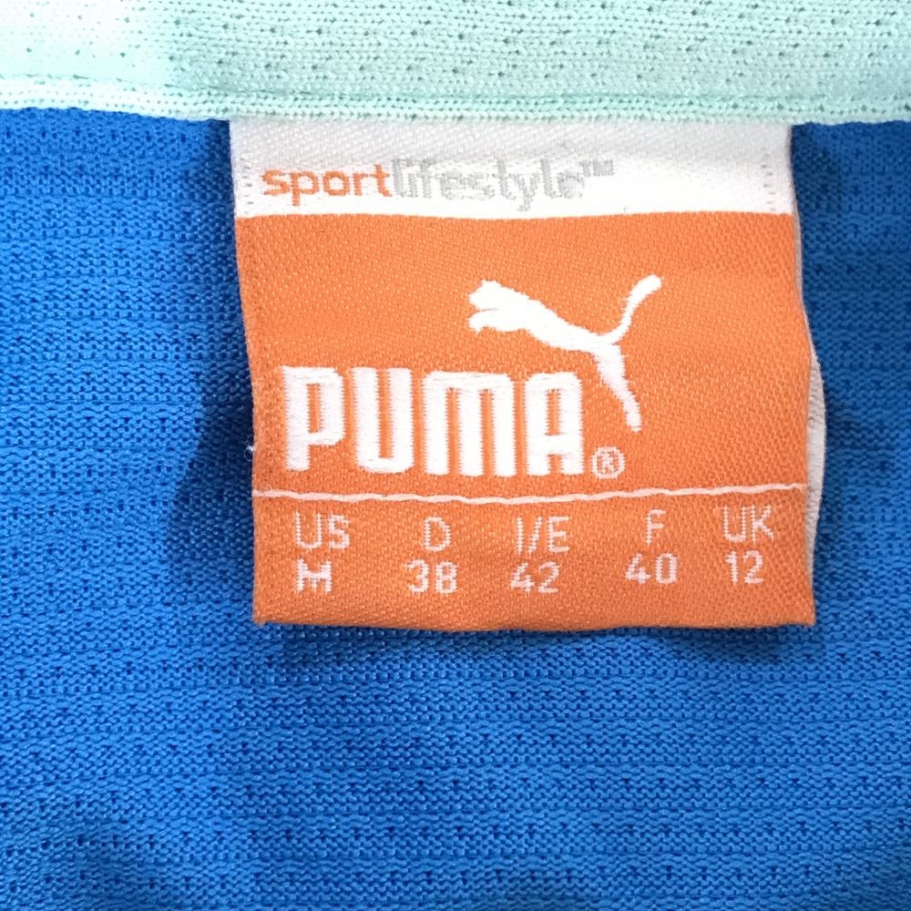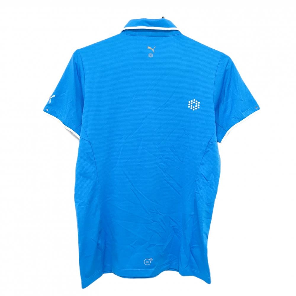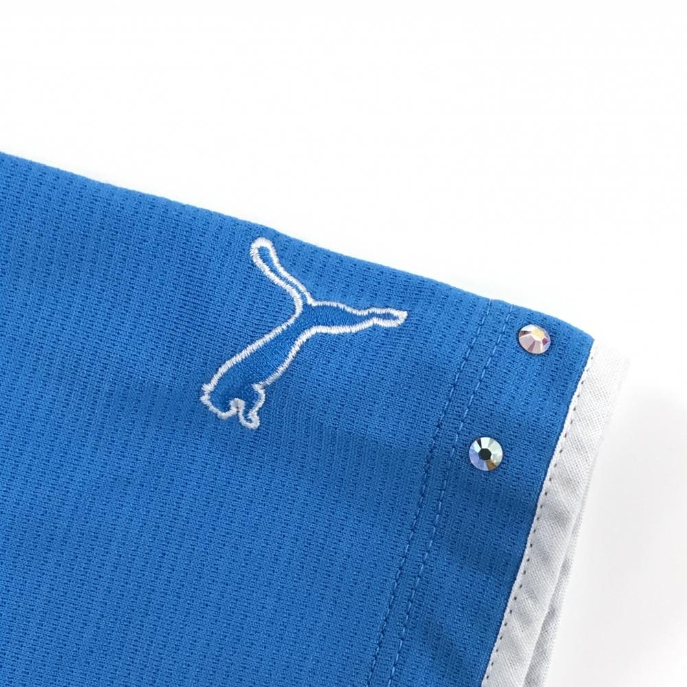 【美品】プーマ 半袖ポロシャツ ブルー×白 袖ロゴ ラインストーン レディース US M ゴルフウェア PUMA