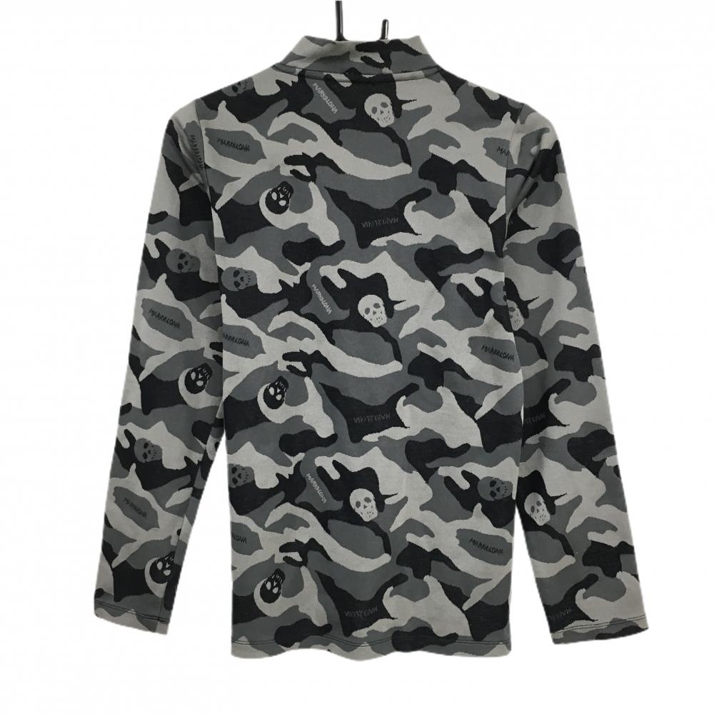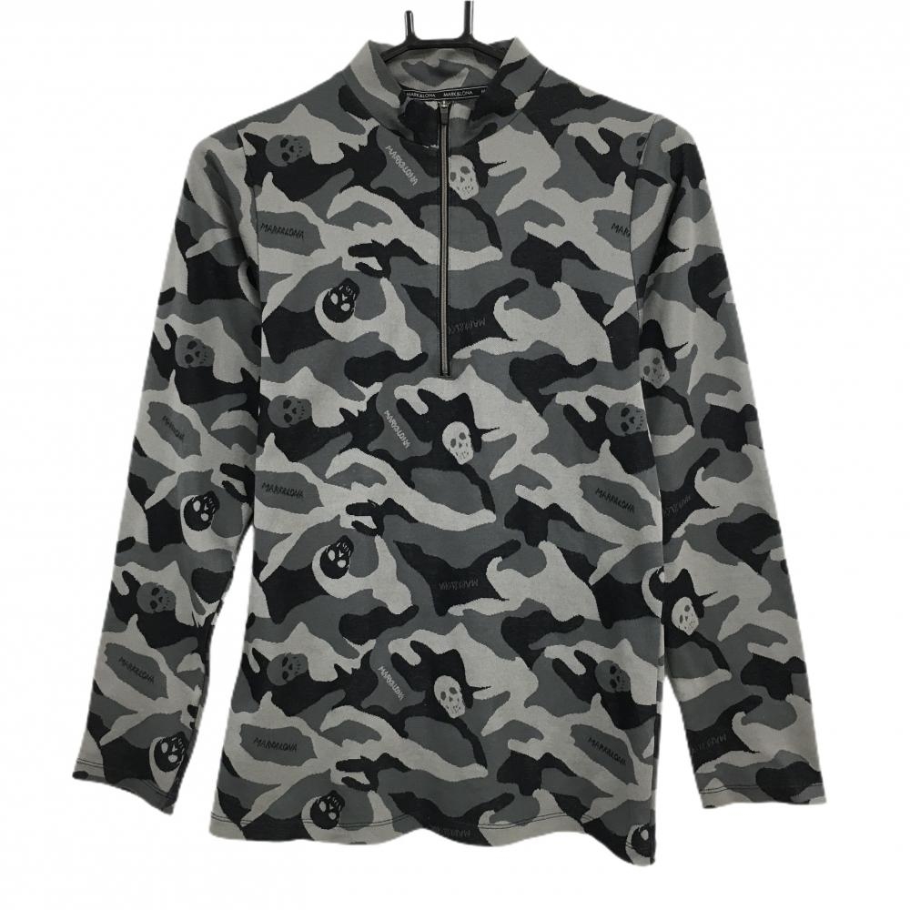 マークアンドロナ 長袖ハイネックシャツ 黒×グレー カモフラ柄 迷彩 スカル ハーフジップ レディース M ゴルフウェア MARK&LONA