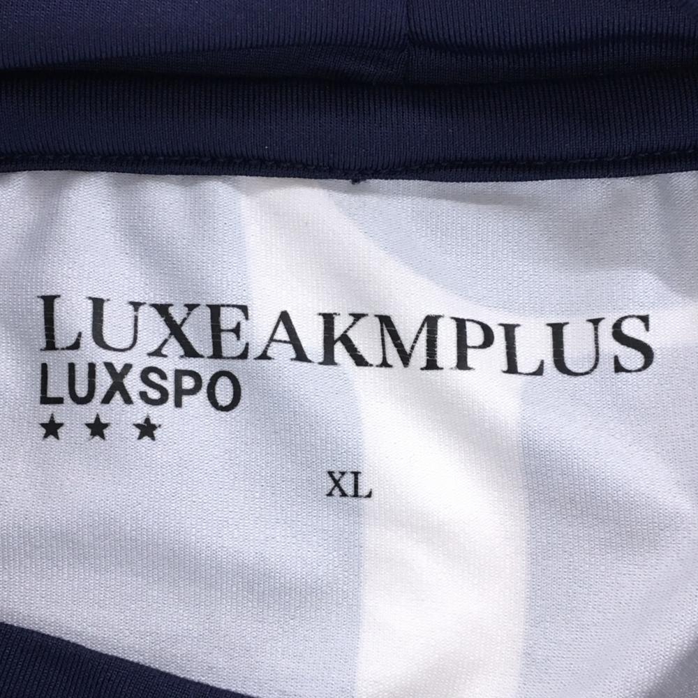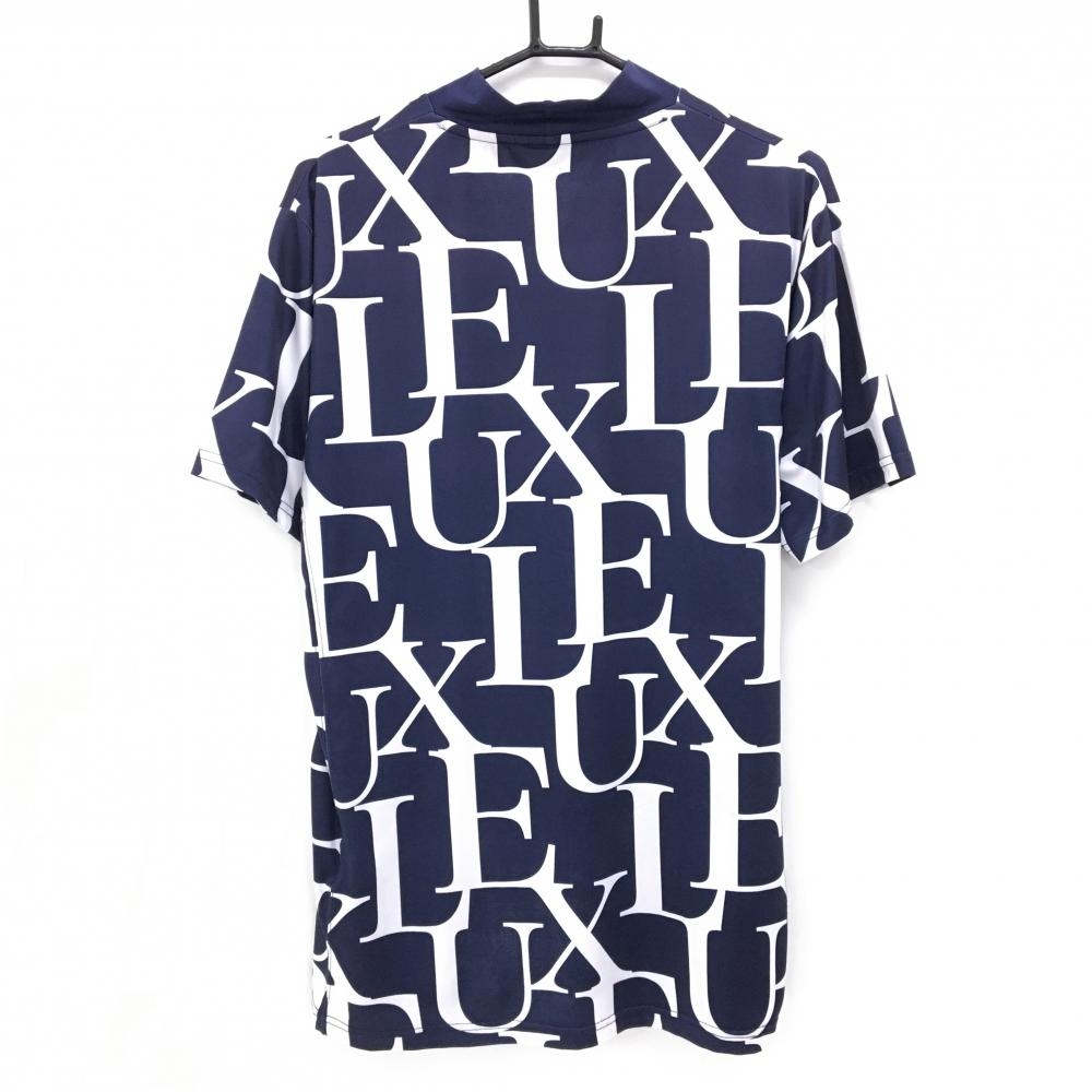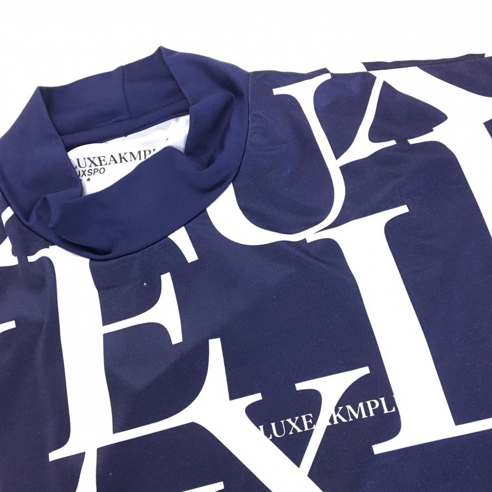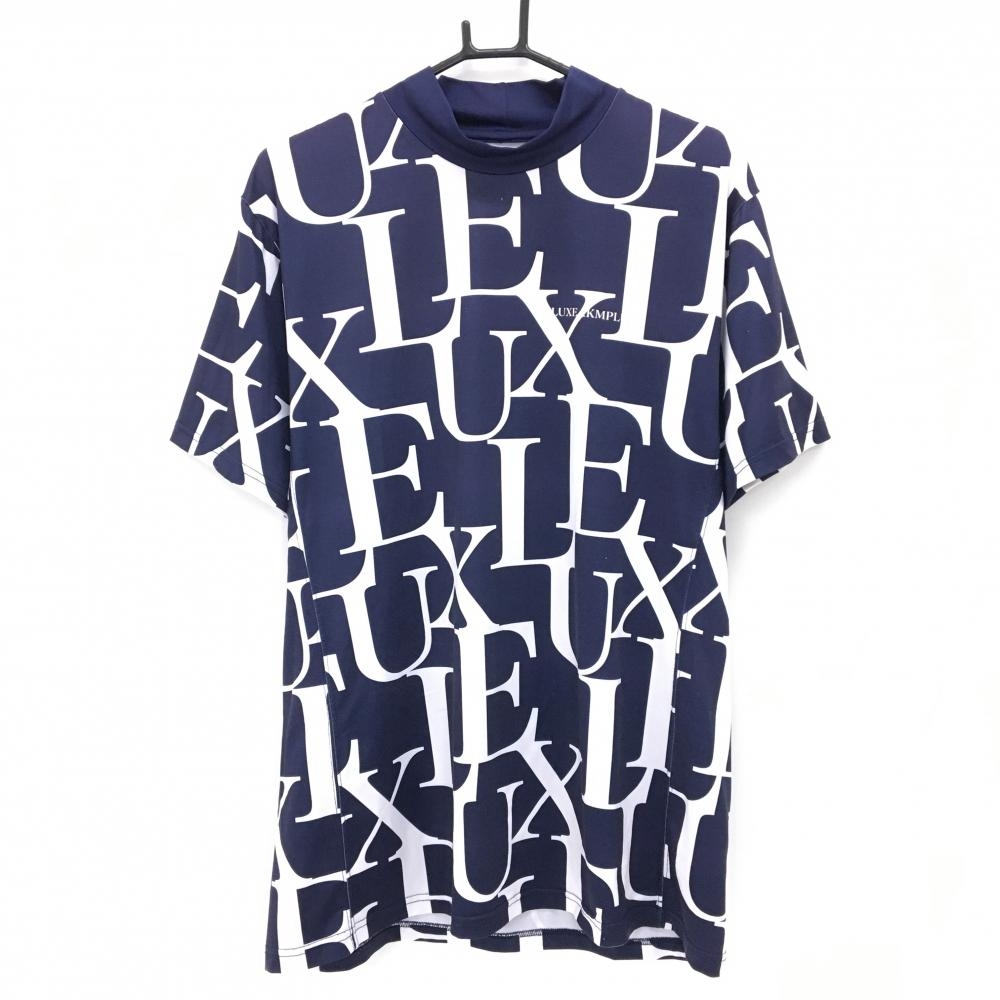 リュクスエイケイエムプラス 半袖ハイネックシャツ ネイビー×白 ロゴ総柄 ストレッチ メンズ XL ゴルフウェア LUXEAKMPLUS