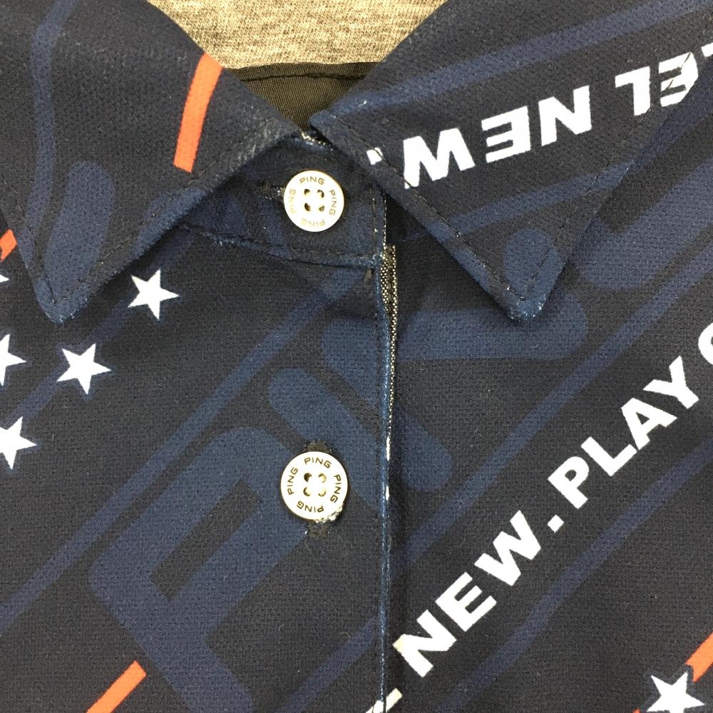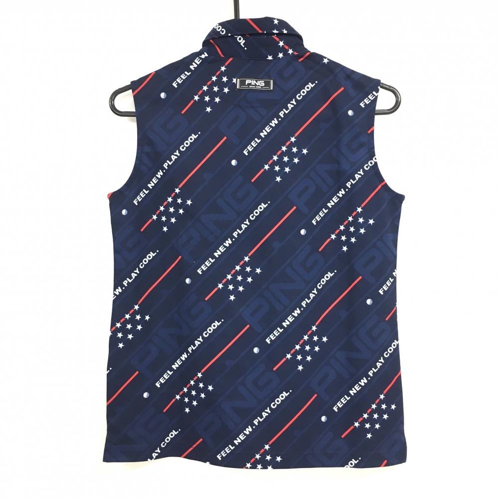 【超美品】ピン ノースリーブポロシャツ ネイビー×白 星柄 ロゴ地模様 斜めストライプ調 レディース M ゴルフウェア PING