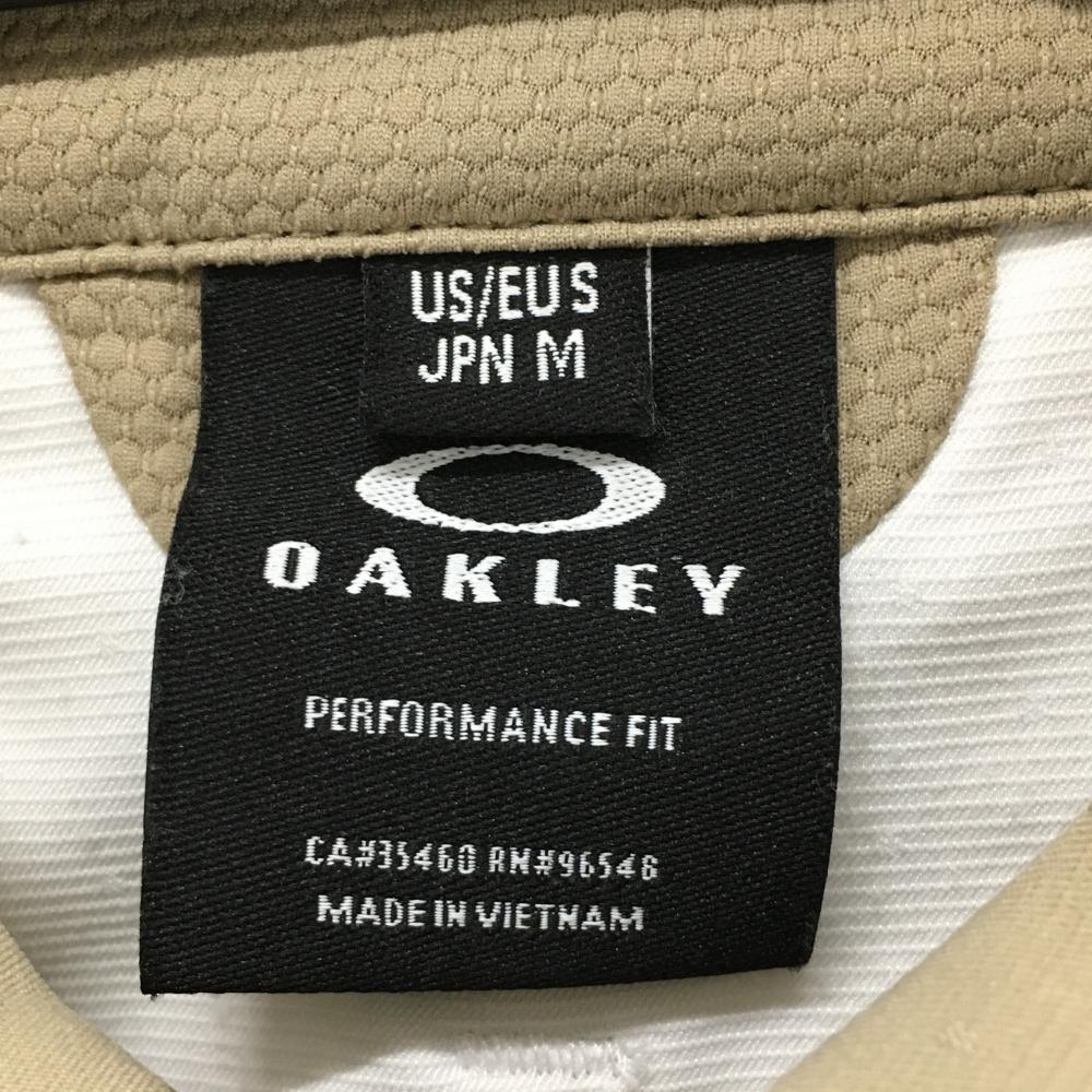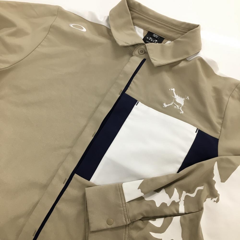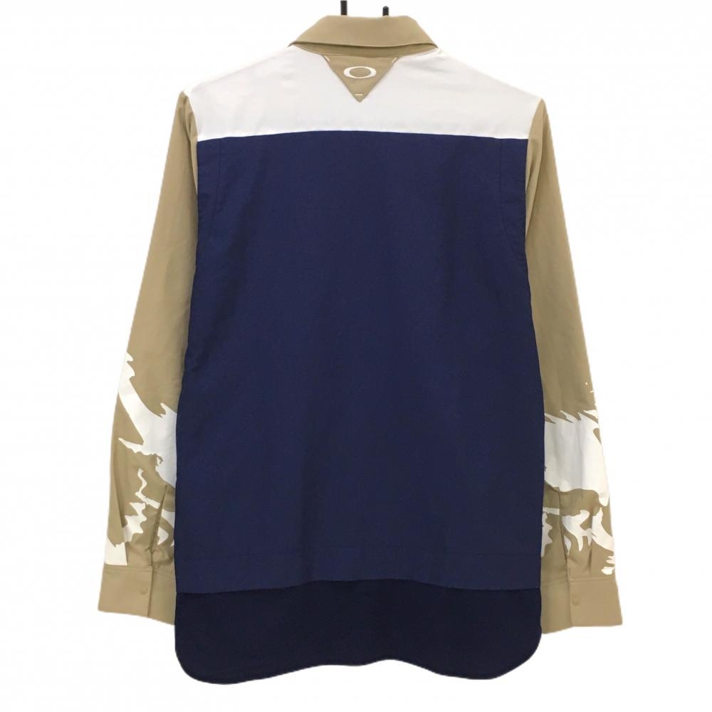 【超美品】オークリー 長袖シャツ ベージュ×ネイビー 地模様 スカル刺しゅう スナップボタン メンズ M ゴルフウェア Oakley