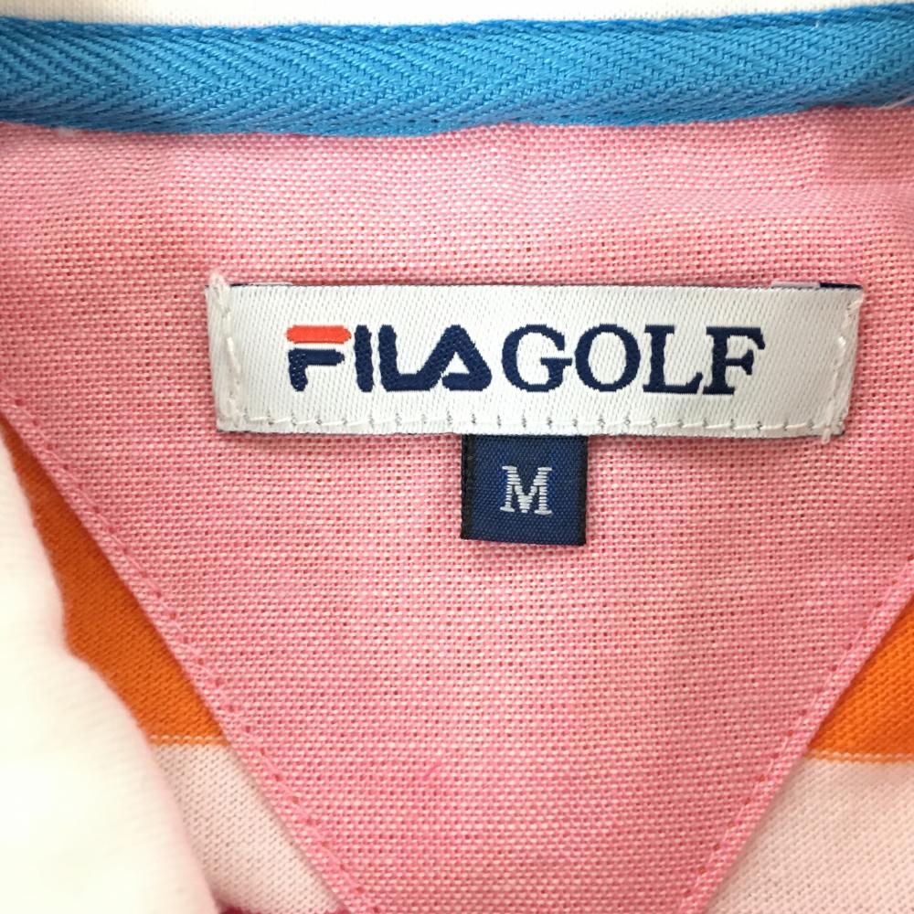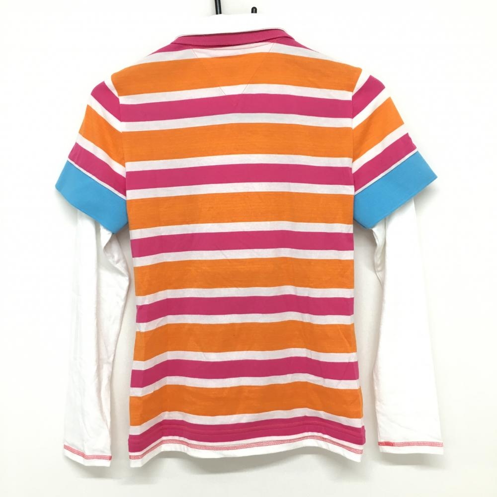 【美品】フィラゴルフ 長袖ポロシャツ オレンジ×ピンク ボーダー柄 ロゴプリント 二重襟 重ね着風 レディース M ゴルフウェア FILA GOLF