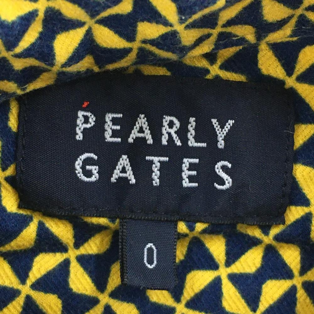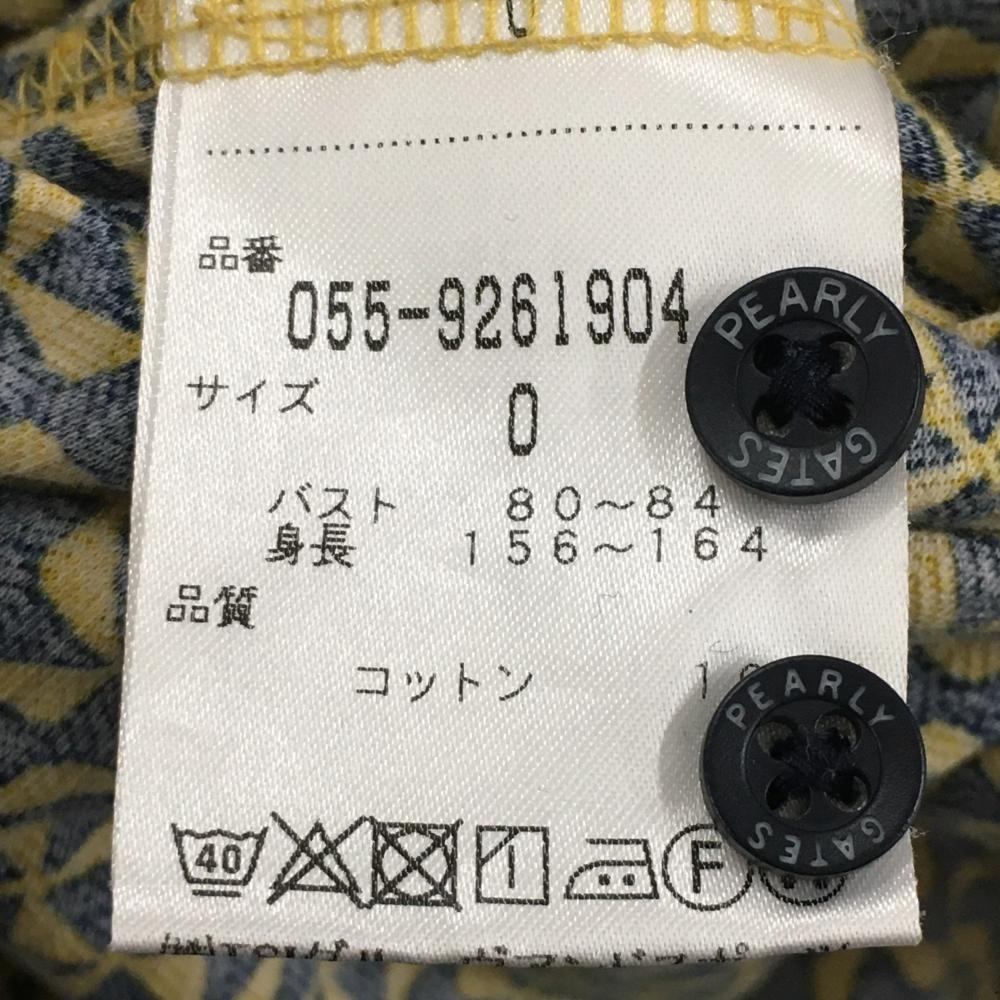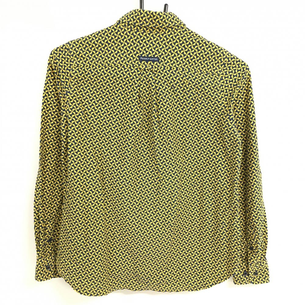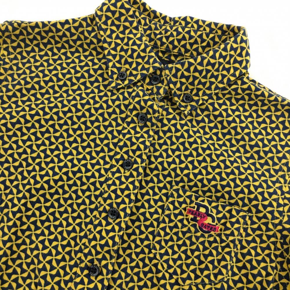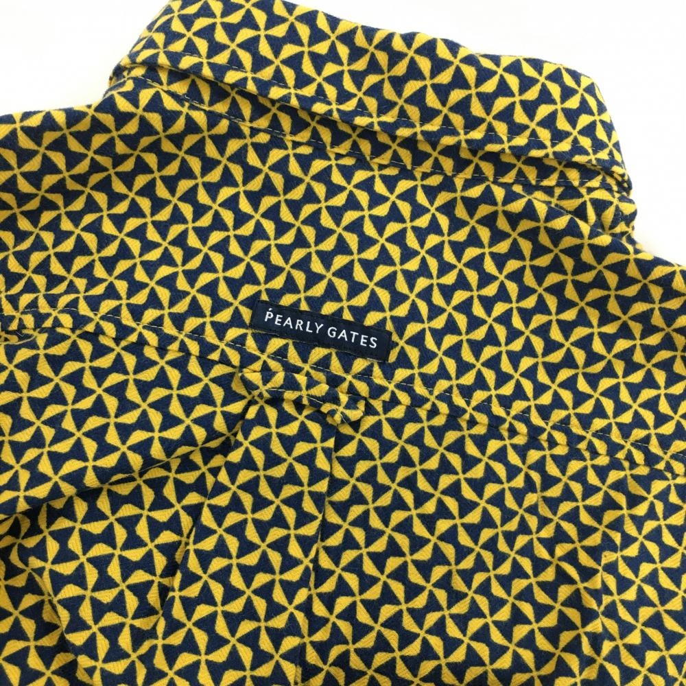 【超美品】パーリーゲイツ 長袖ポロシャツ イエロー×ネイビー リボン総柄 ボタンダウン レディース 0(S) ゴルフウェア PEARLY GATES