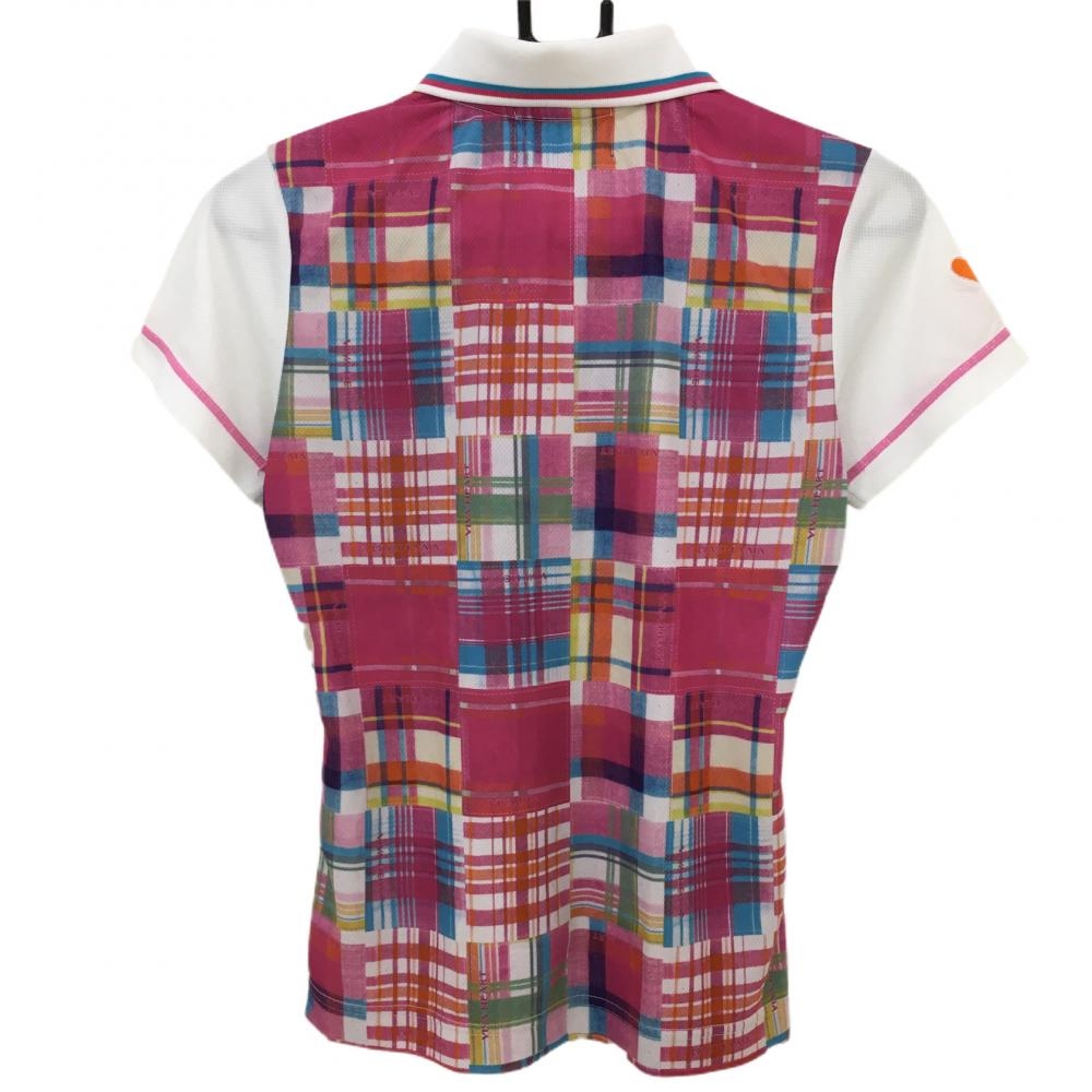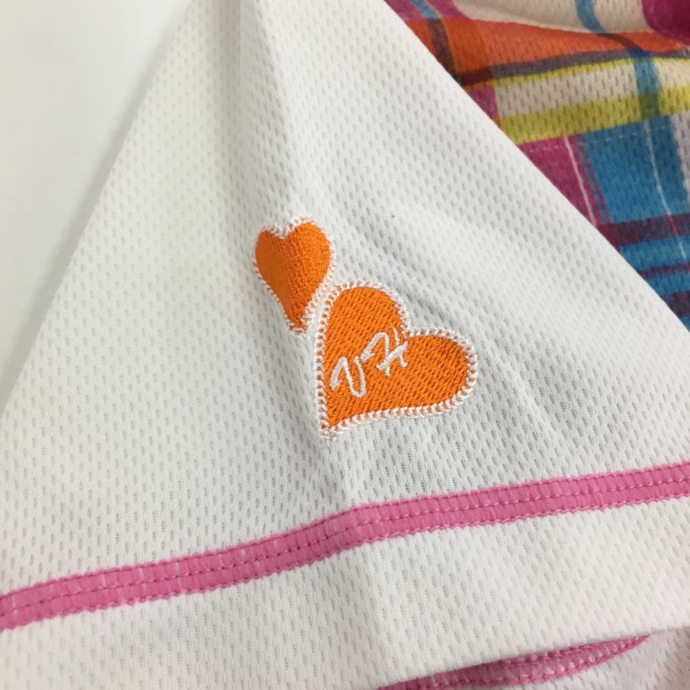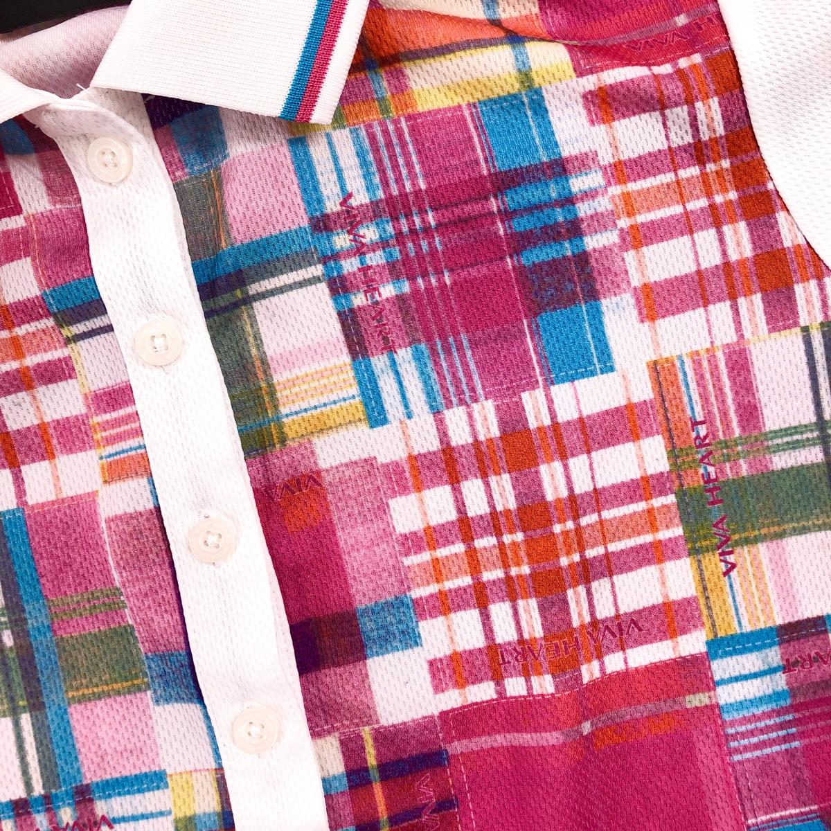 【美品】ビバハート 半袖ポロシャツ ピンク×ライトブルー チェック レディース 40 ゴルフウェア VIVA HEART