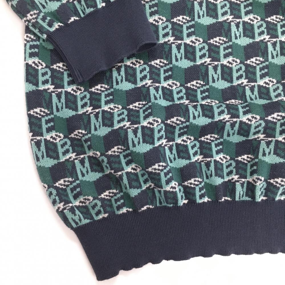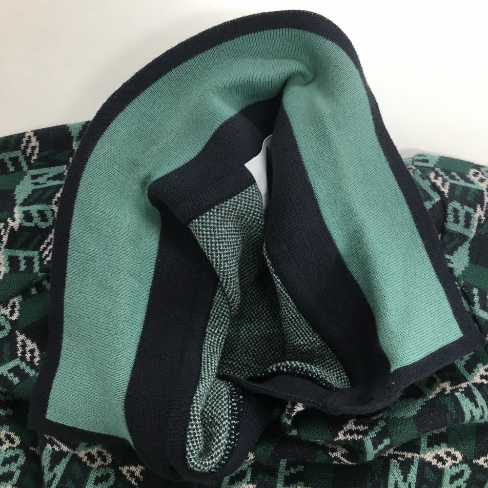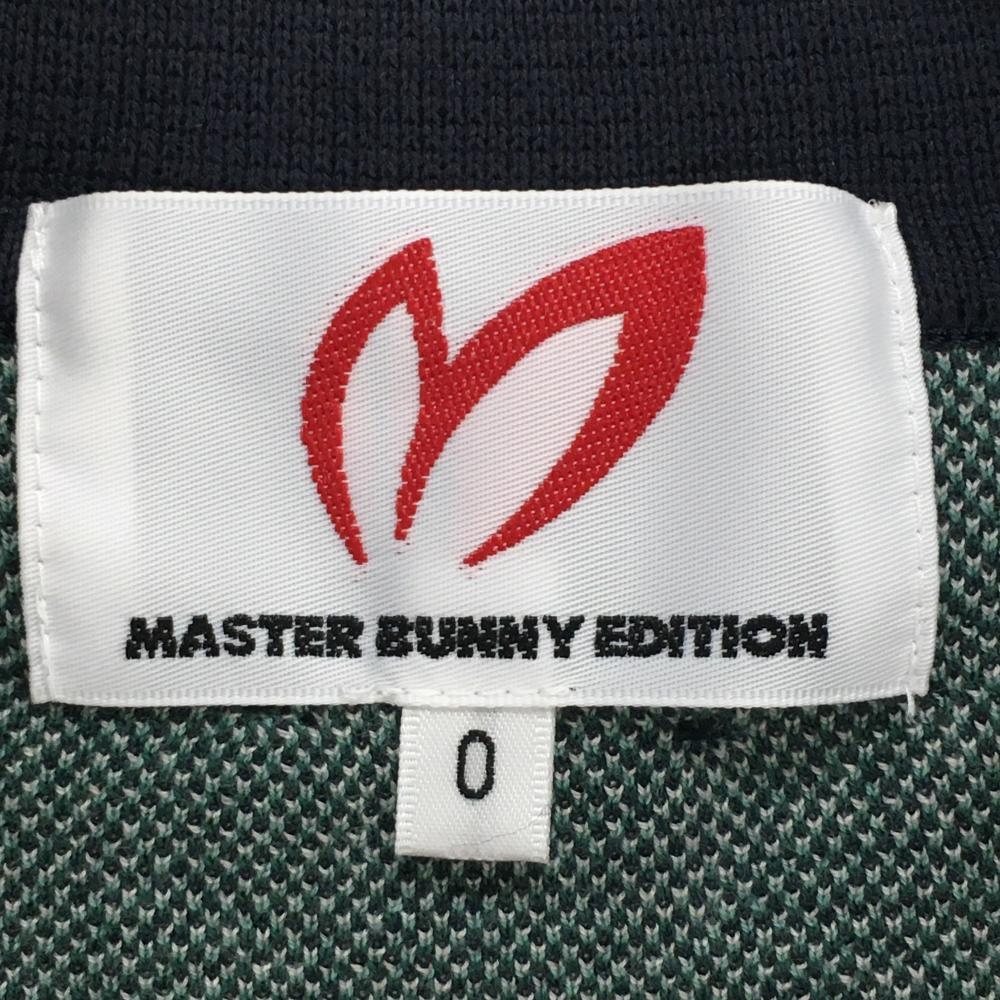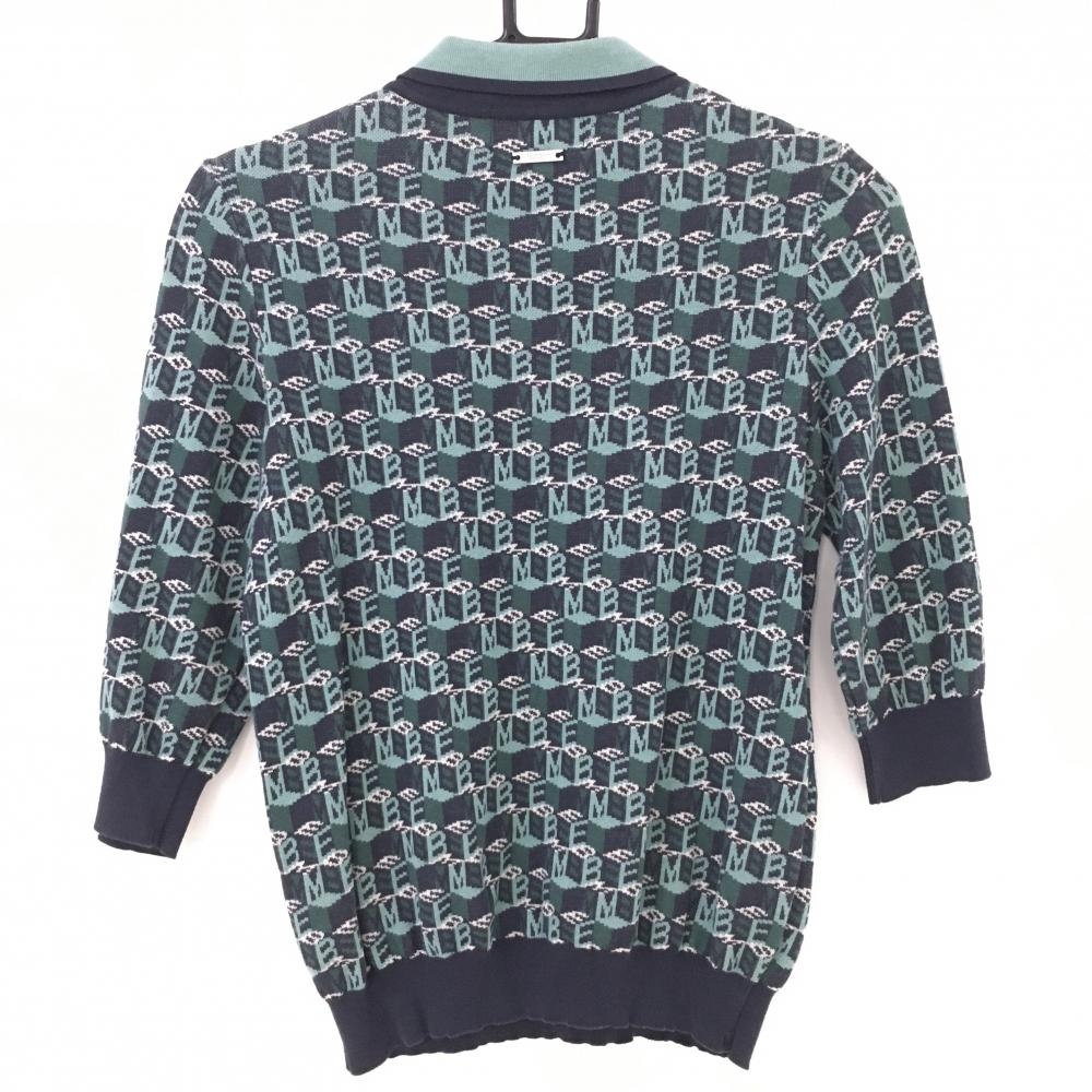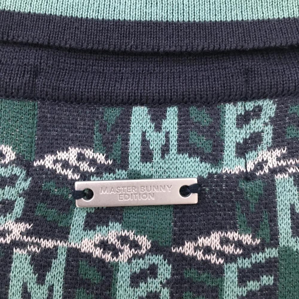 【美品】マスターバニー 七分袖ニットポロシャツ ライトブルー×ネイビー ロゴ総柄 レディース 0(S) ゴルフウェア MASTER BUNNY EDITION