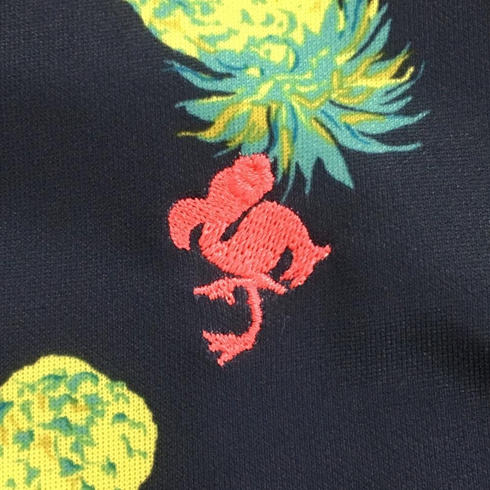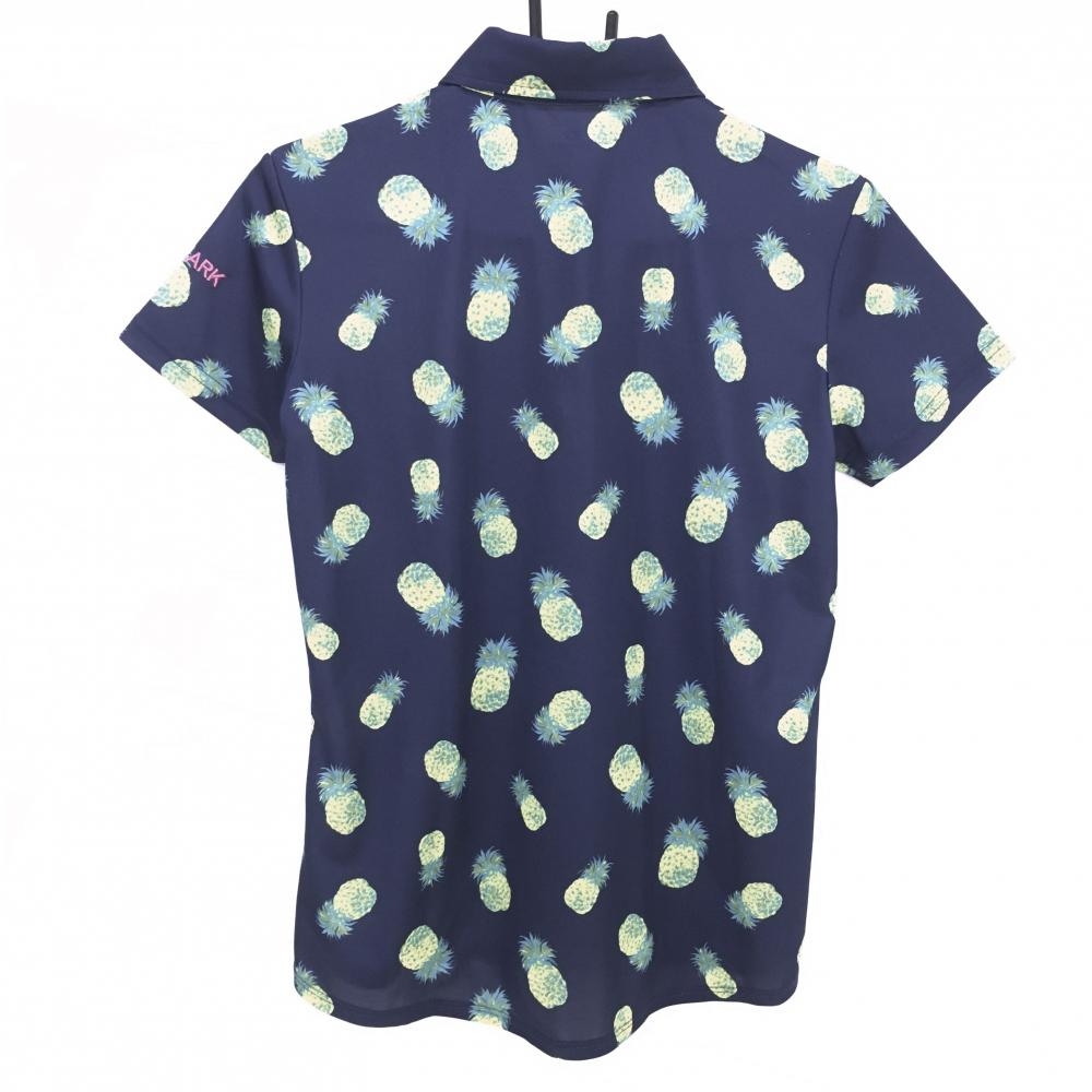 【超美品】キスマークゴルフ 半袖ポロシャツ ネイビー×イエロー パイナップル柄 ボタンダウン レディース M ゴルフウェア Kissmark