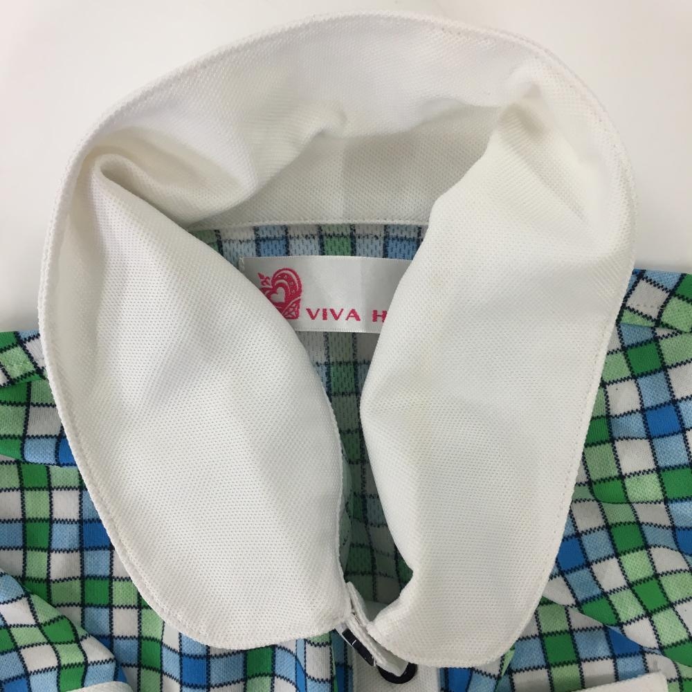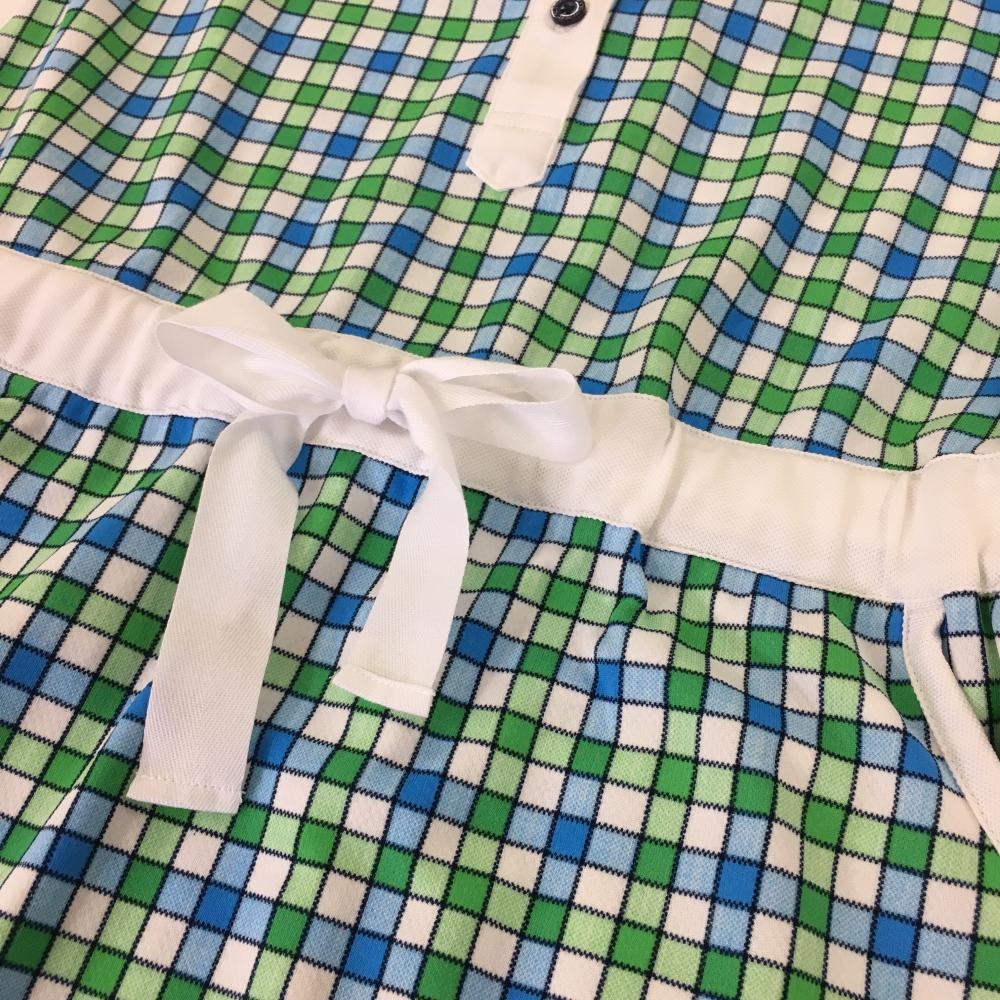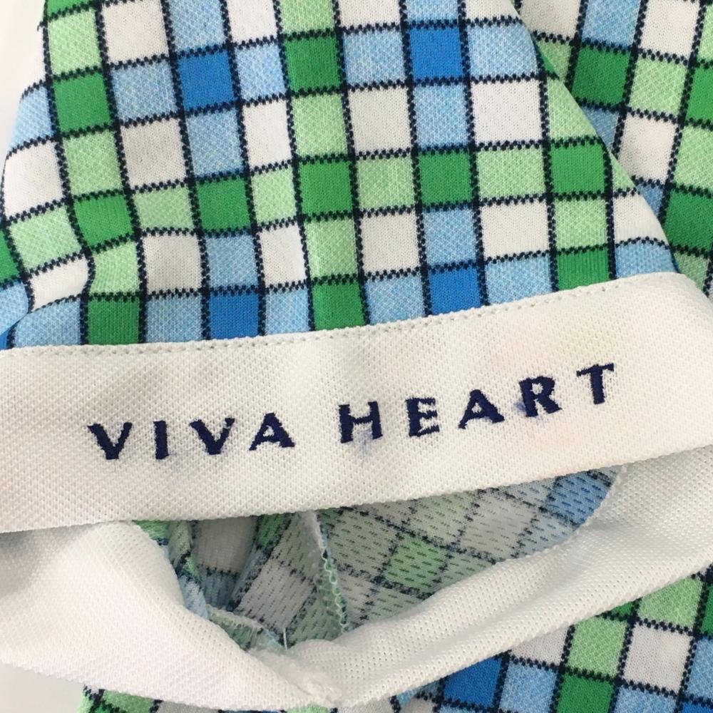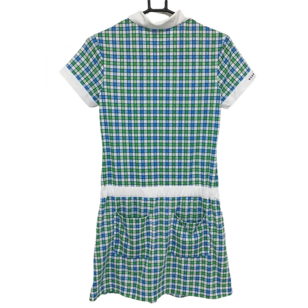 ビバハート 半袖ポロワンピース 白×グリーン チェック 胸ポケット ウエストリボン レディース 40(M) ゴルフウェア VIVA HEART