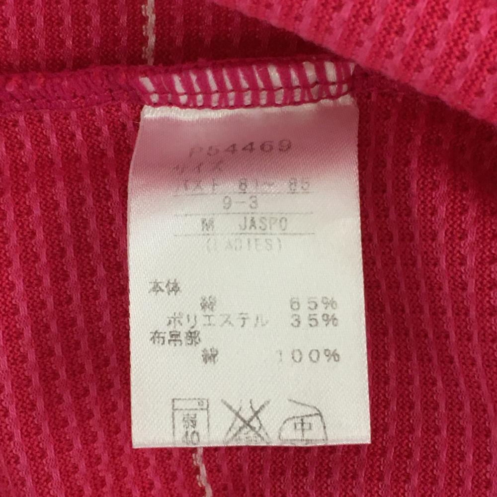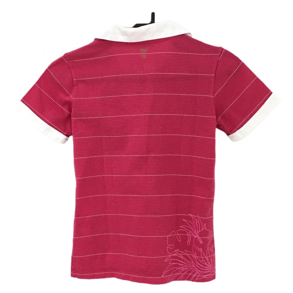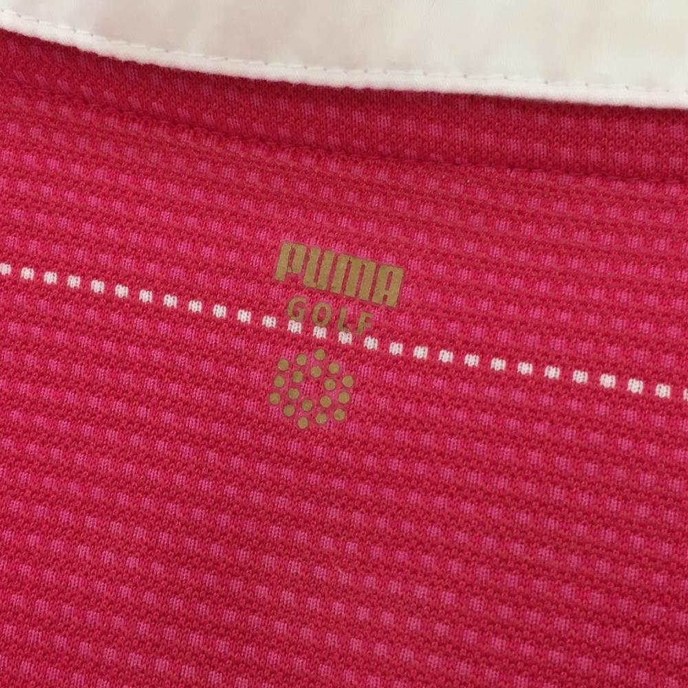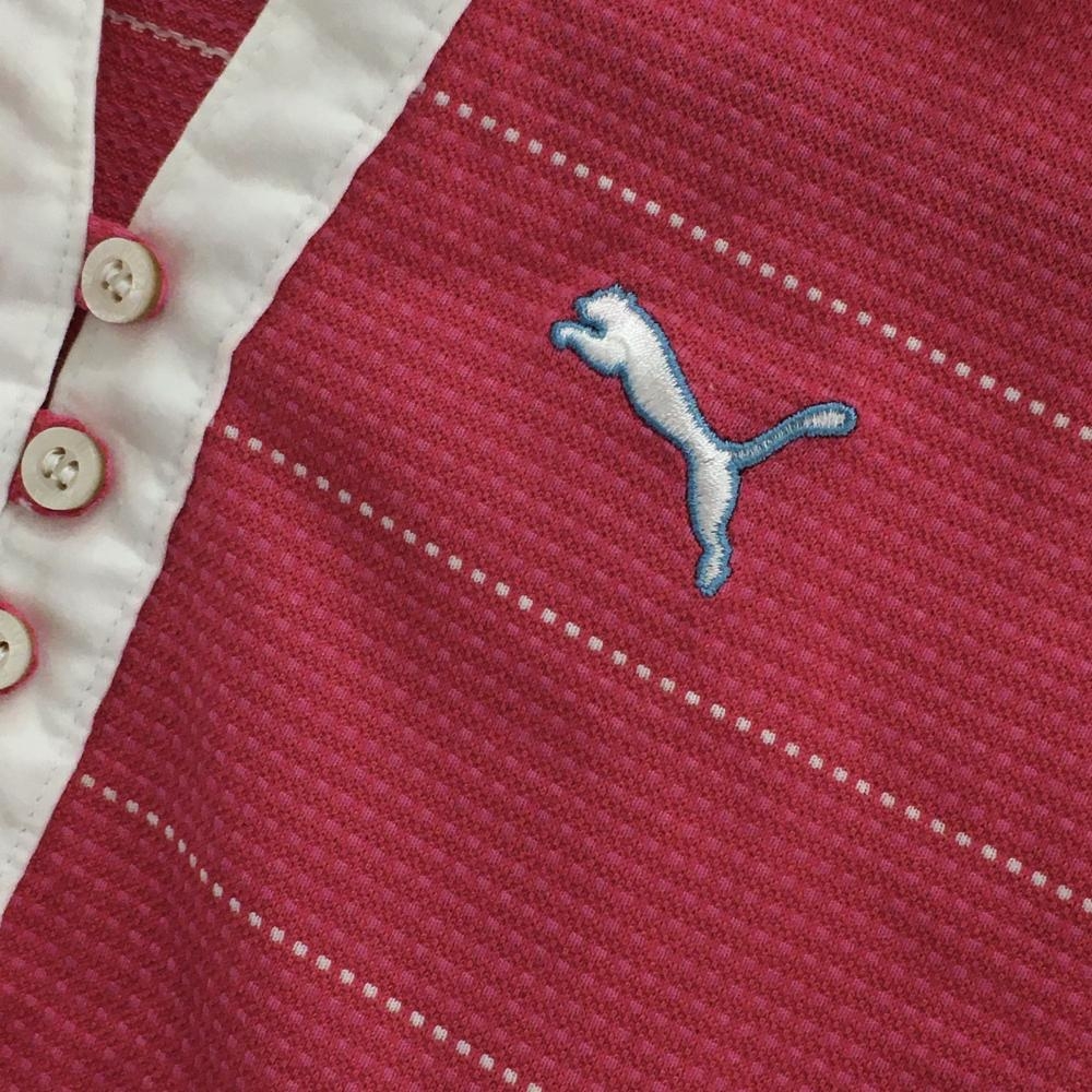 【美品】プーマ 半袖スキッパーシャツ ピンク×白 ボーダー 襟裏ロゴ レディース M ゴルフウェア PUMA