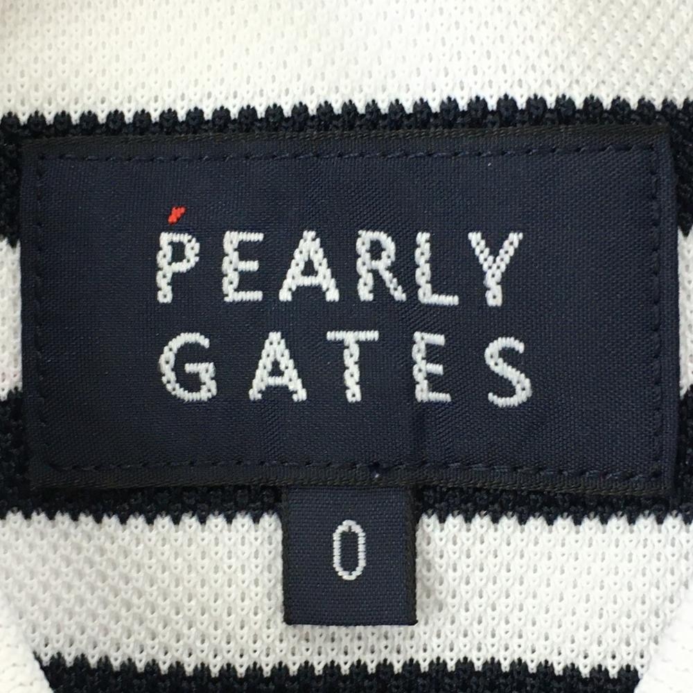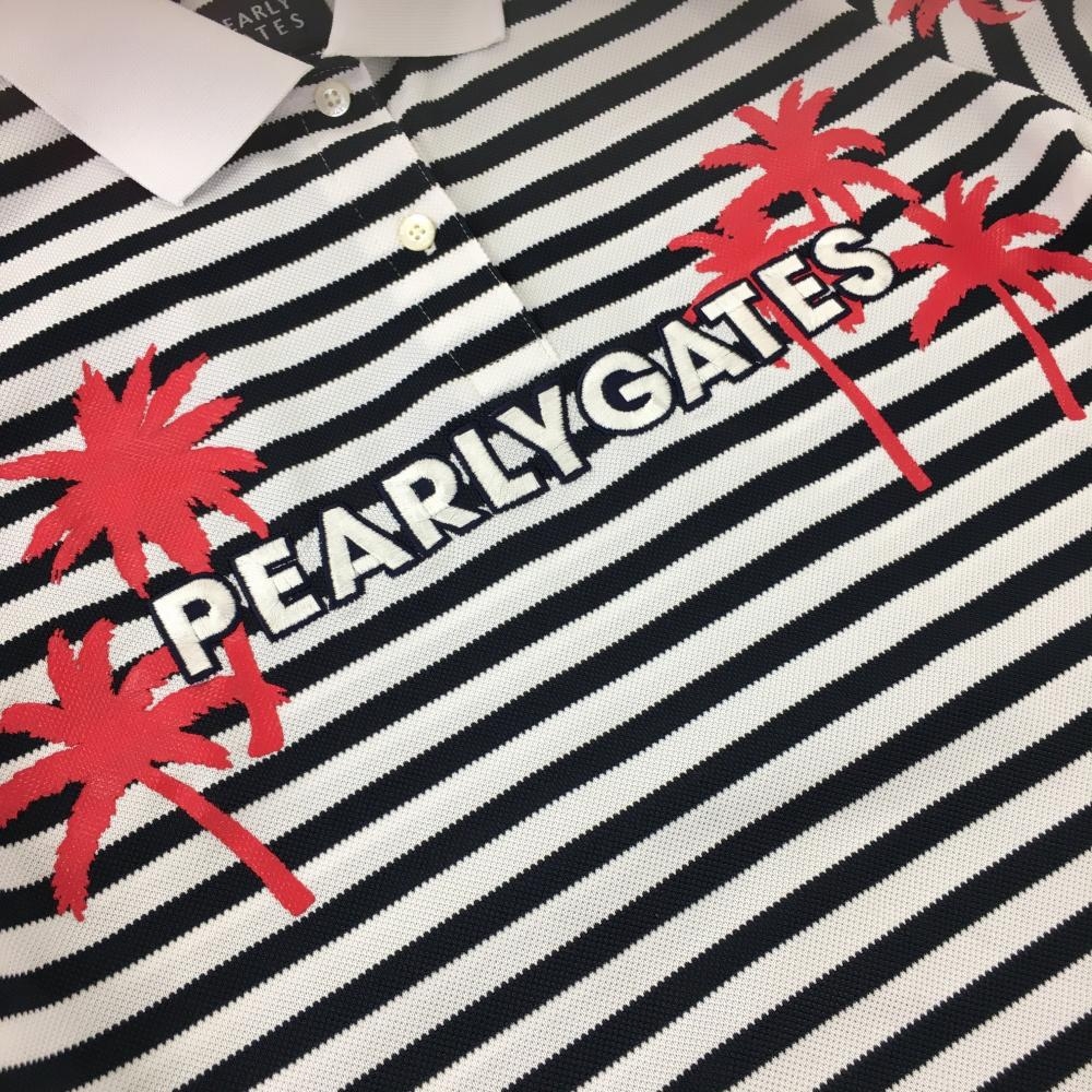 【超美品】パーリーゲイツ 半袖ポロシャツ 白×ダークネイビー ボーダー ヤシの木プリント レディース 0(S) ゴルフウェア PEARLY GATES