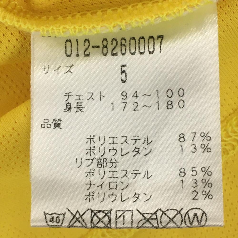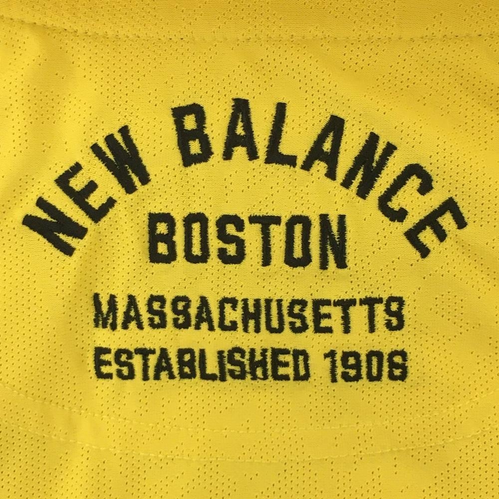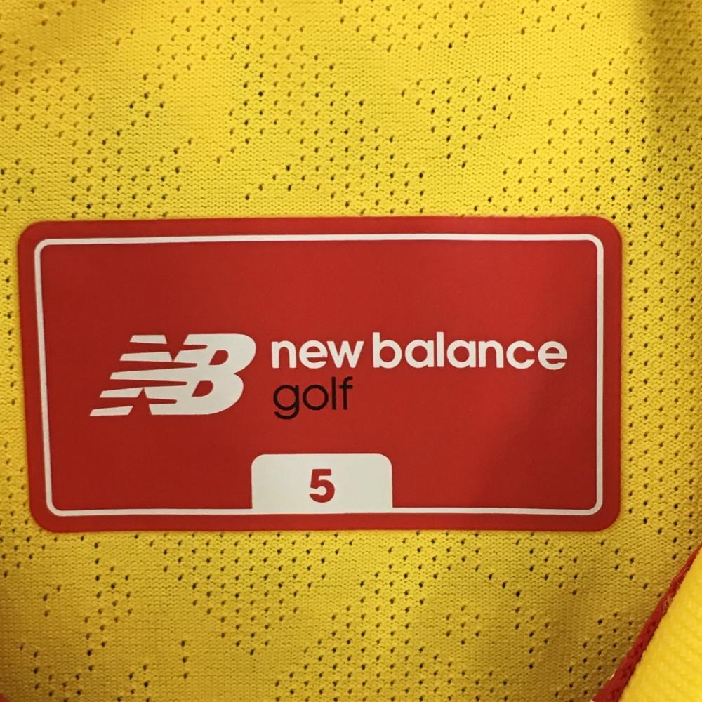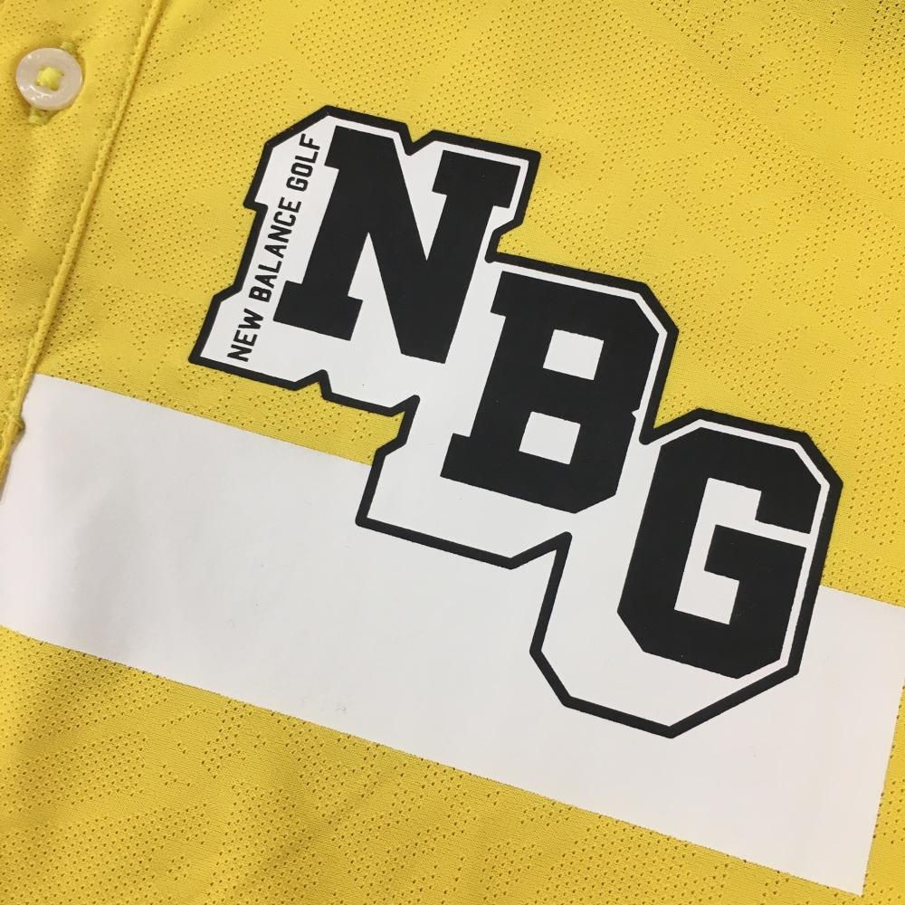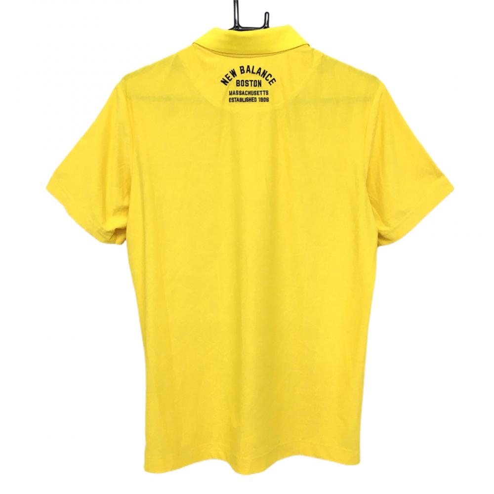 【美品】ニューバランスゴルフ 半袖ポロシャツ イエロー×白 一部ボーダー 織生地 胸元プリント メンズ 5(L) ゴルフウェア New Balance