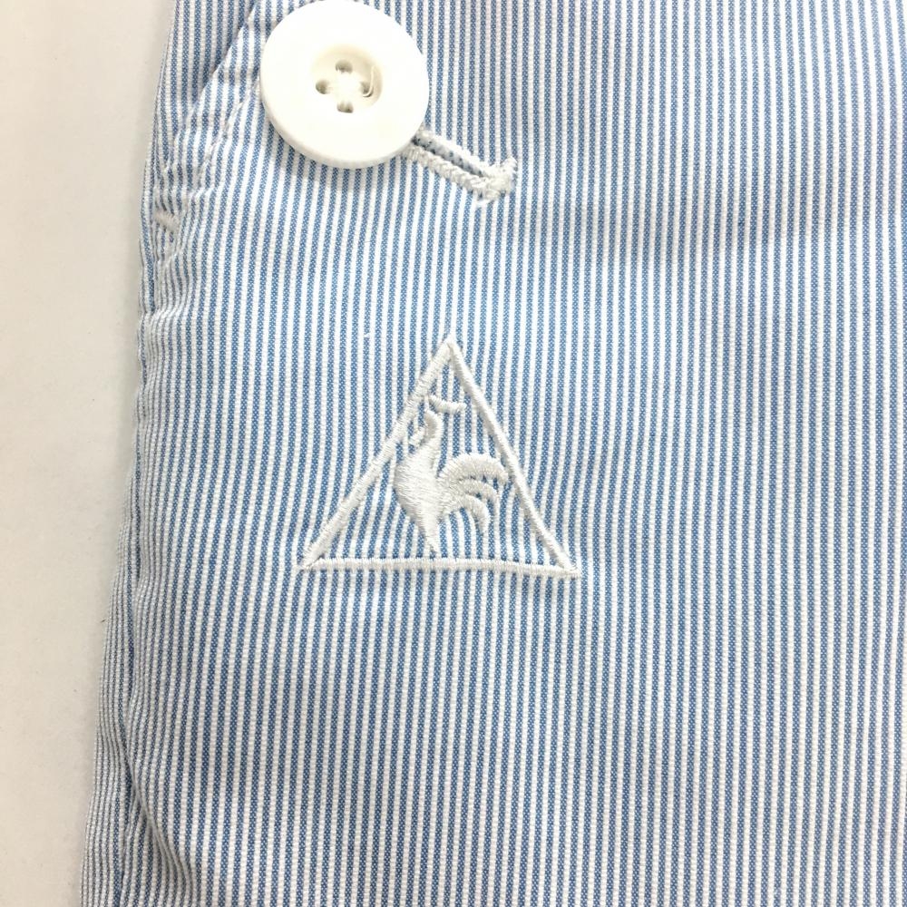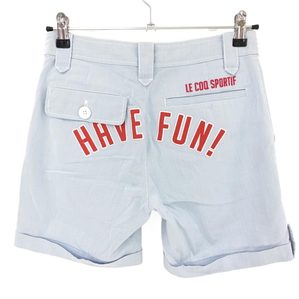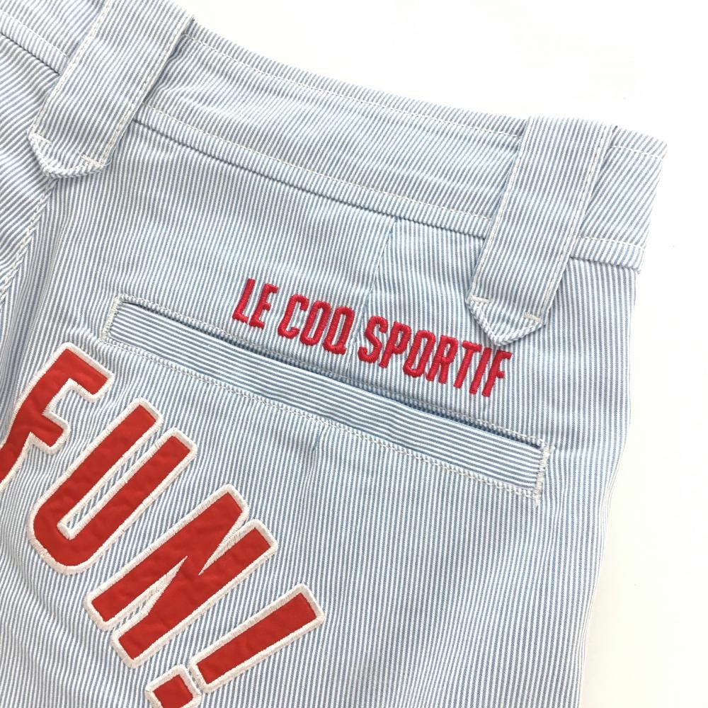【美品】ルコック ショートパンツ ライトブルー×白 細ストライプ バックロゴ刺しゅう レディース 9(M) ゴルフウェア le coq sportif