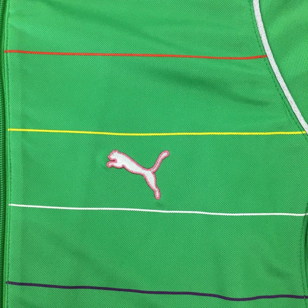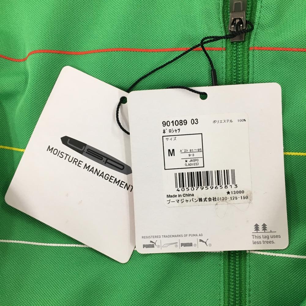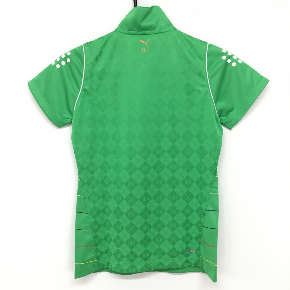 【新品】プーマ 半袖ハイネックシャツ グリーン×マルチ 前ボーダー 後ろアーガイル織生地 ハーフジップ レディース M ゴルフウェア PUMA