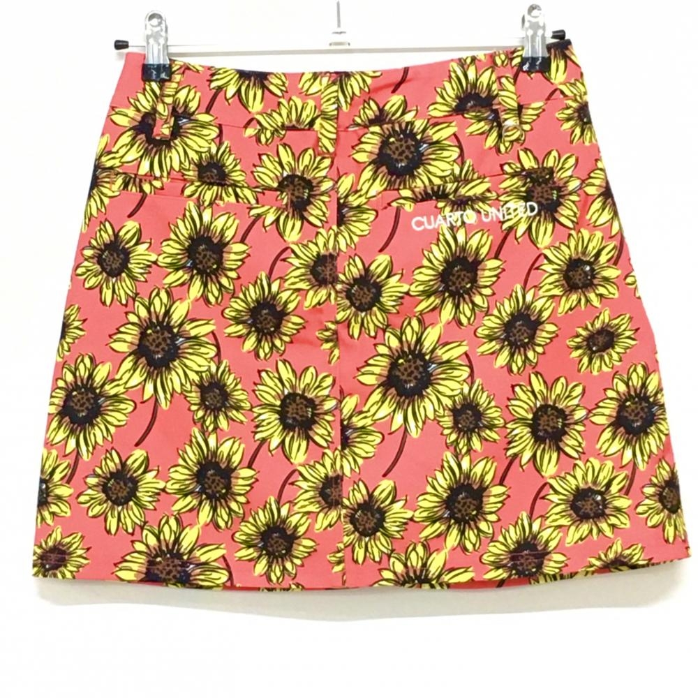 【超美品】クアルトユナイテッド スカート レッドピンク×イエロー ヒマワリ柄 ロゴ刺しゅう レディース M ゴルフウェア CUARTO UNITED