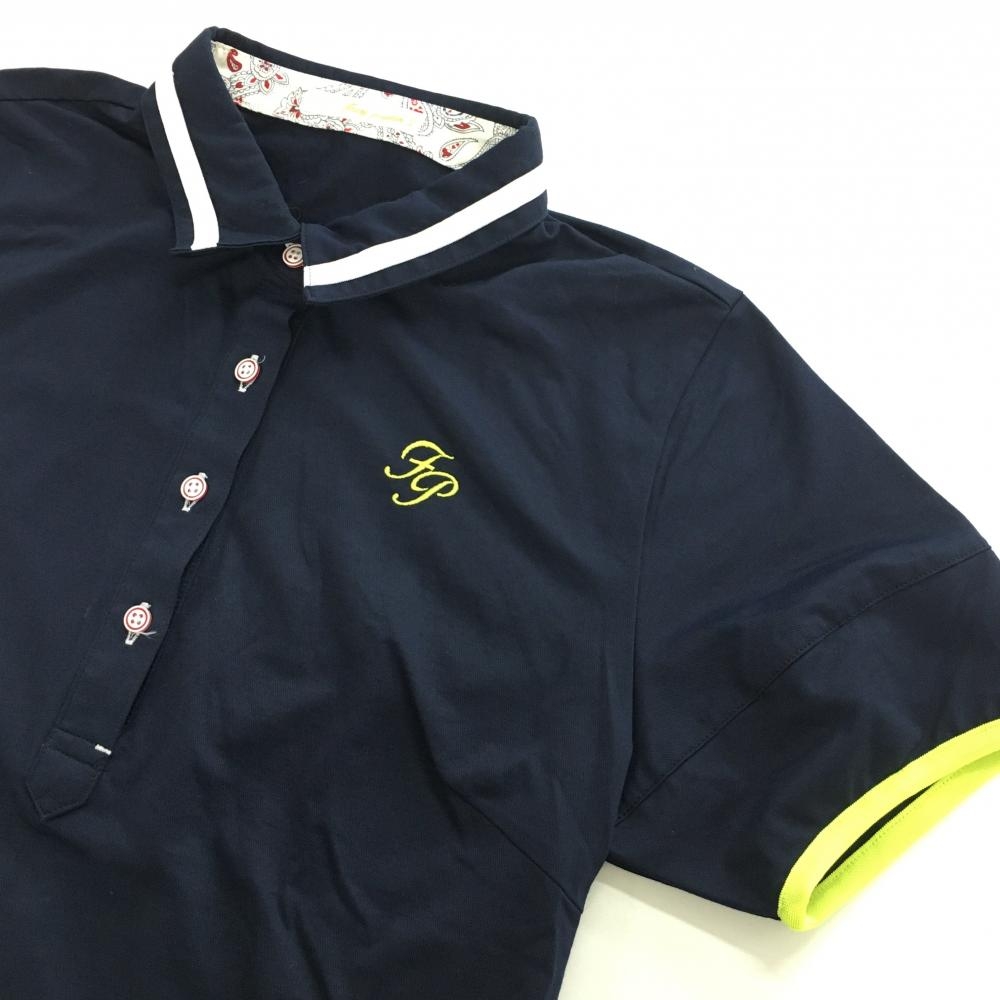 【美品】フェアリーパウダー 半袖ポロシャツ ネイビー イエロー刺しゅう 襟ライン パフスリーブ レディース S ゴルフウェア FAIRY POWDER