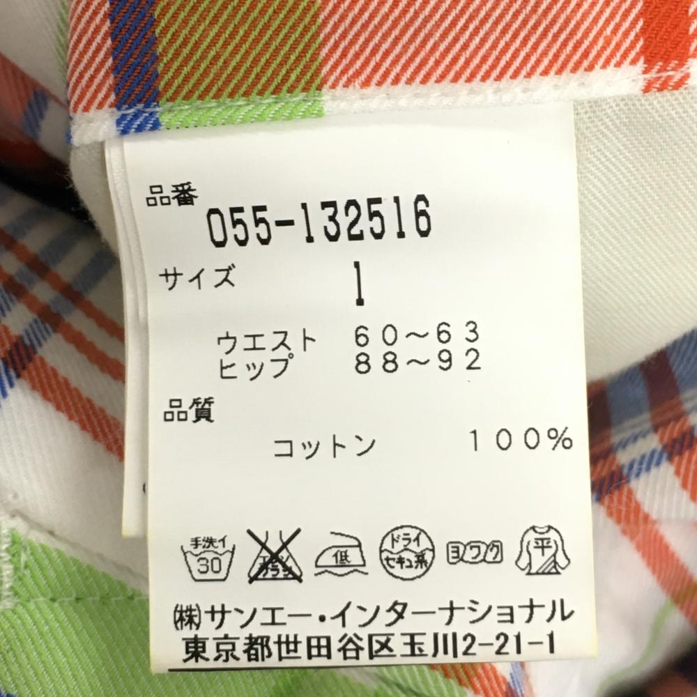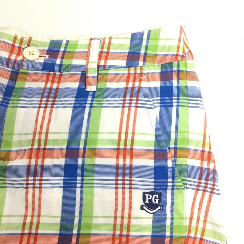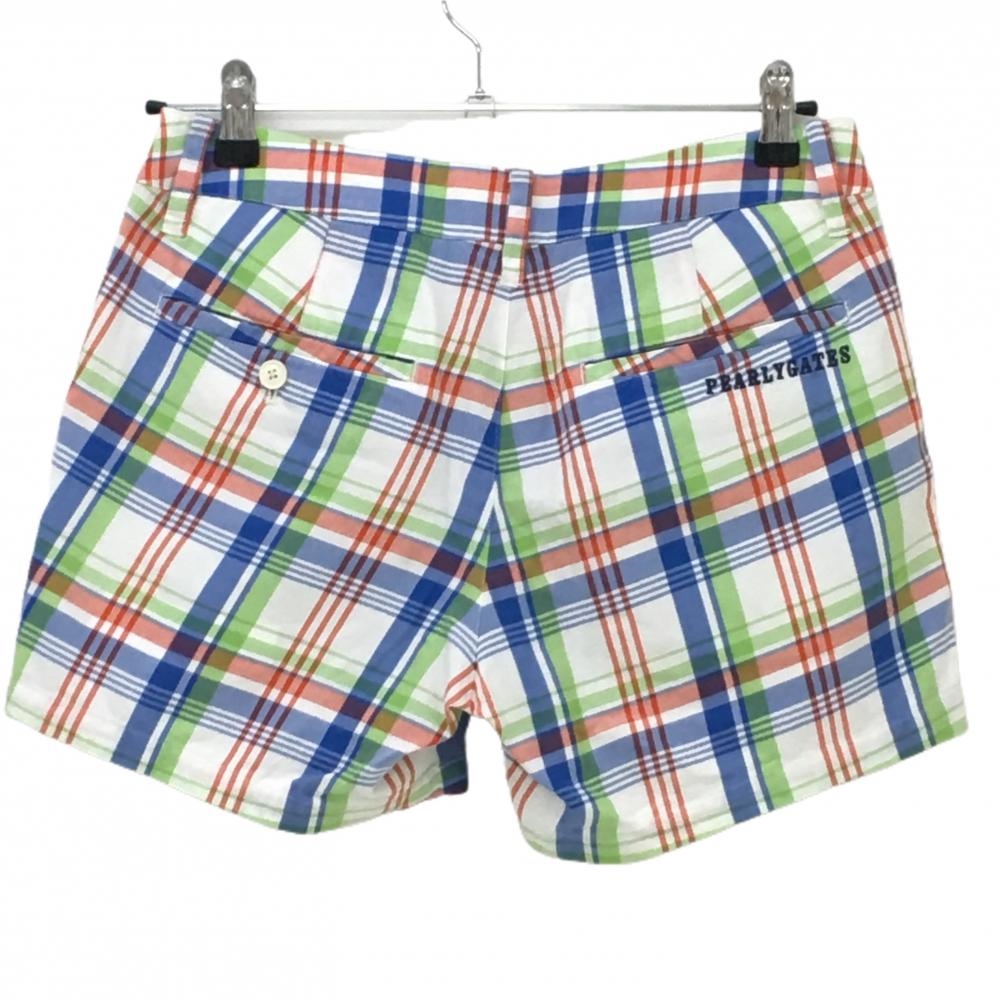 【美品】パーリーゲイツ ショートパンツ 白×ブルー×ライトグリーン チェック ロゴ刺しゅう レディース 1(M) ゴルフウェア PEARLY GATES