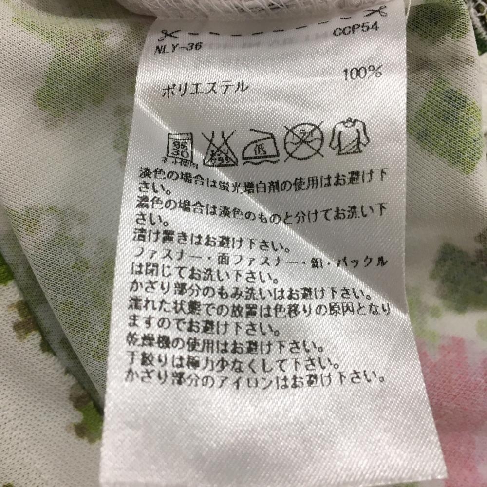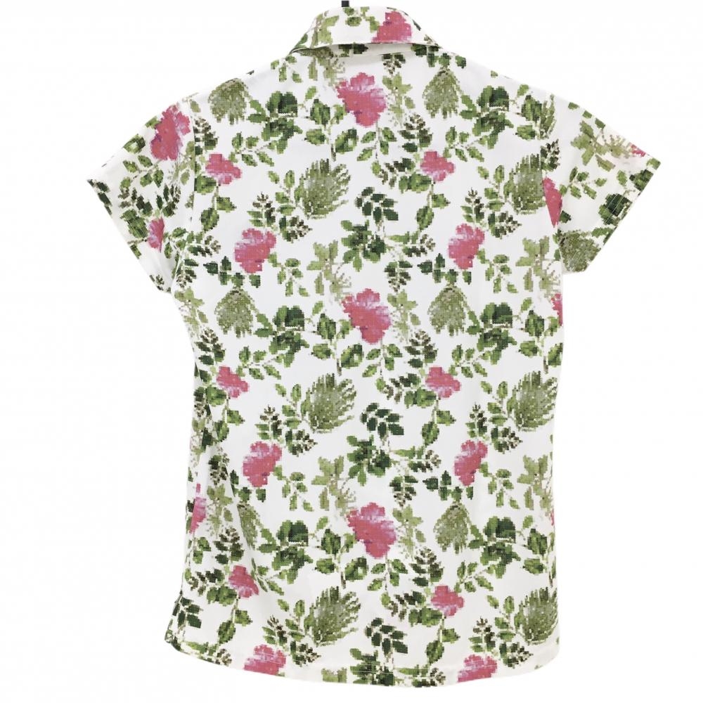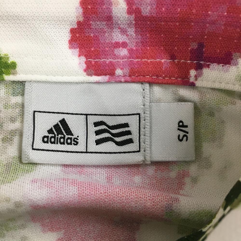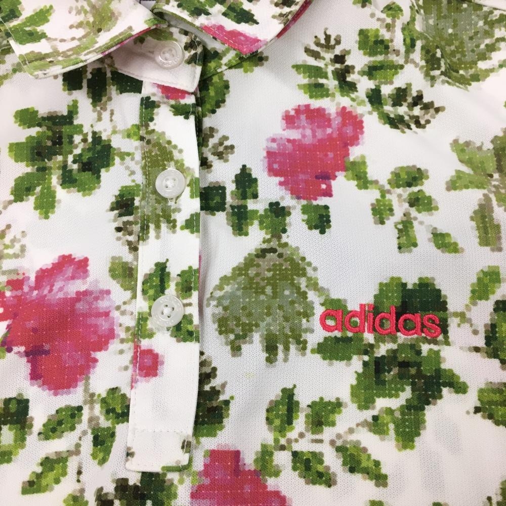 【超美品】アディダス 半袖ポロシャツ 白×グリーン 花柄 織生地 ロゴ刺しゅう レディース S/P ゴルフウェア adidas