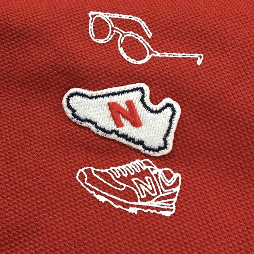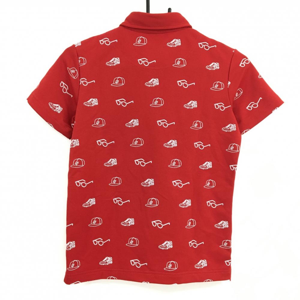 【超美品】ニューバランスゴルフ 半袖ポロシャツ レッド×白 総柄 キャップ スニーカーワッペン レディース 0(S) ゴルフウェア New Balance